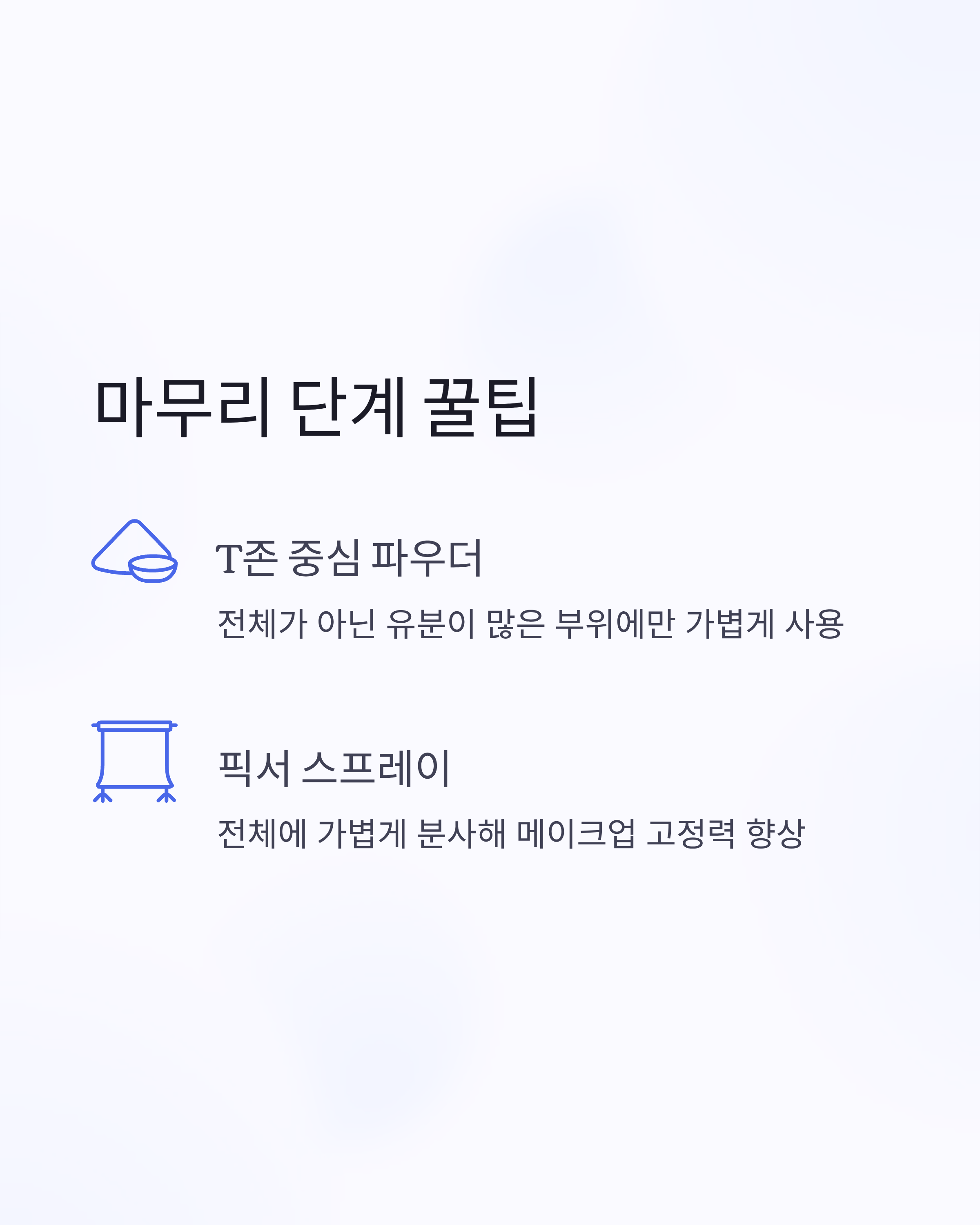 | 파우더 | 유분 흡착, 보송한 마무리 | 과도한 사용 시 각질 부각 |