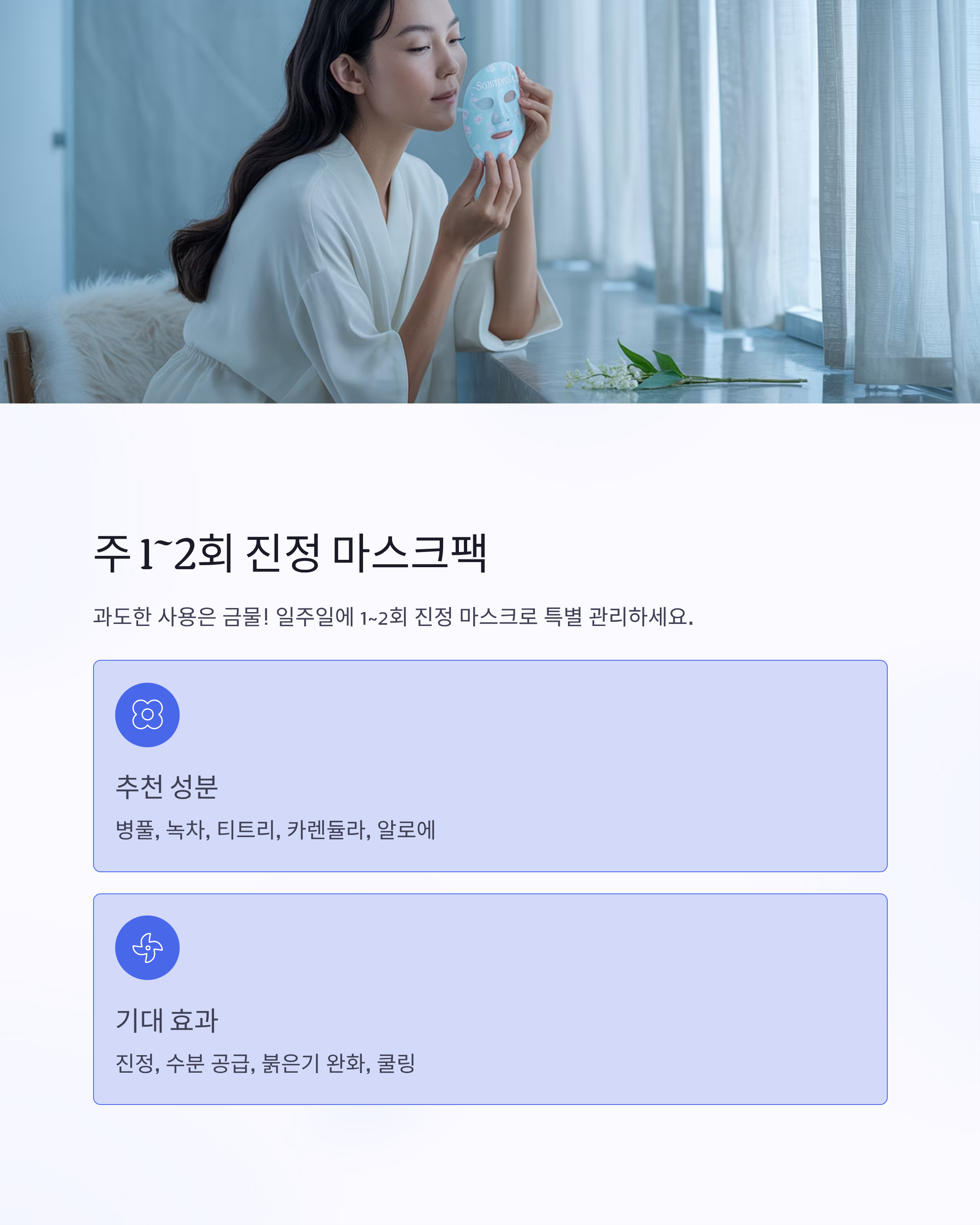 | 주 1~2회 | 병풀, 녹차, 티트리 | 진정, 수분 공급 |
