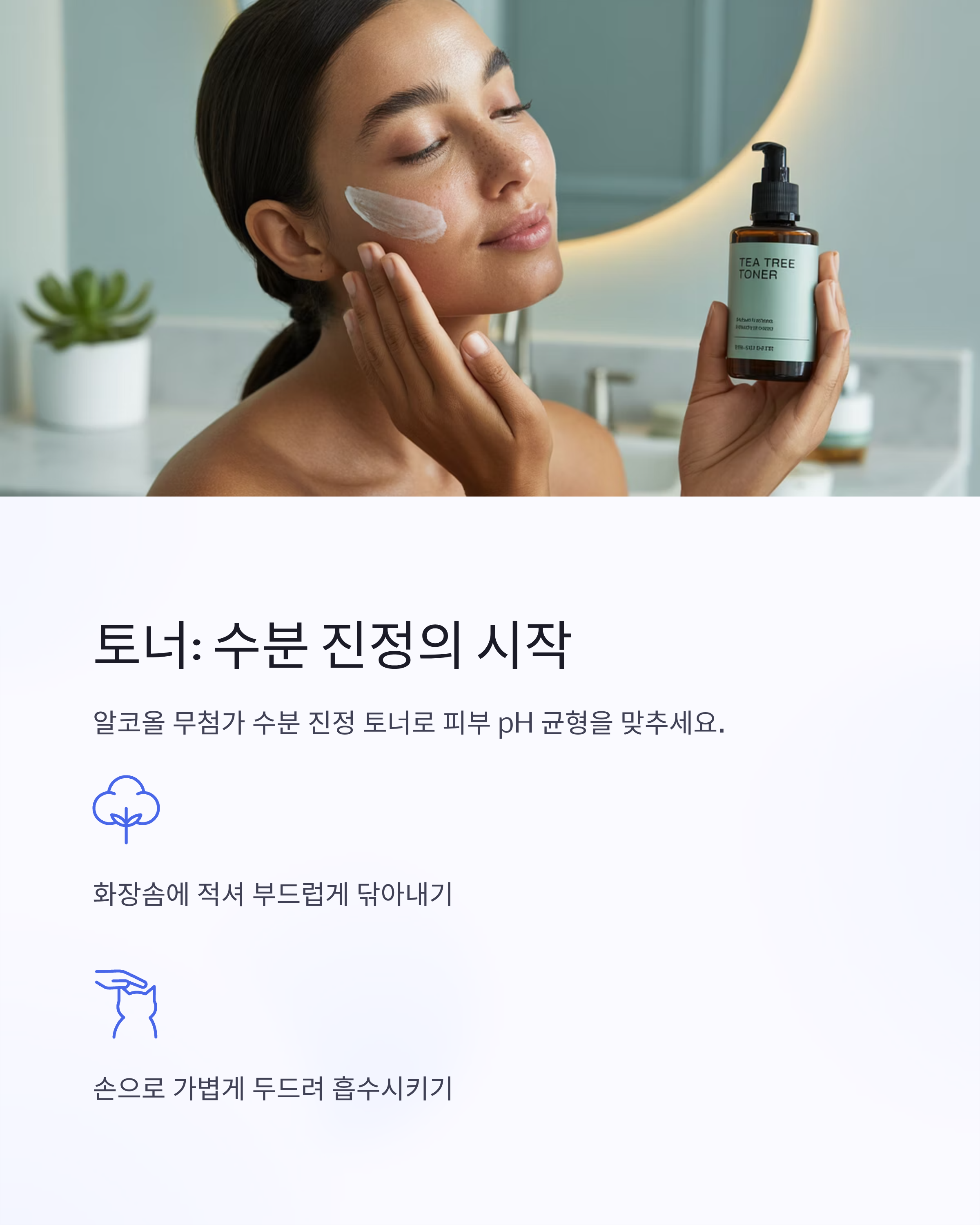 토너를 화장솜에 적셔 부드럽게 닦아내거나 손으로 흡수시켜