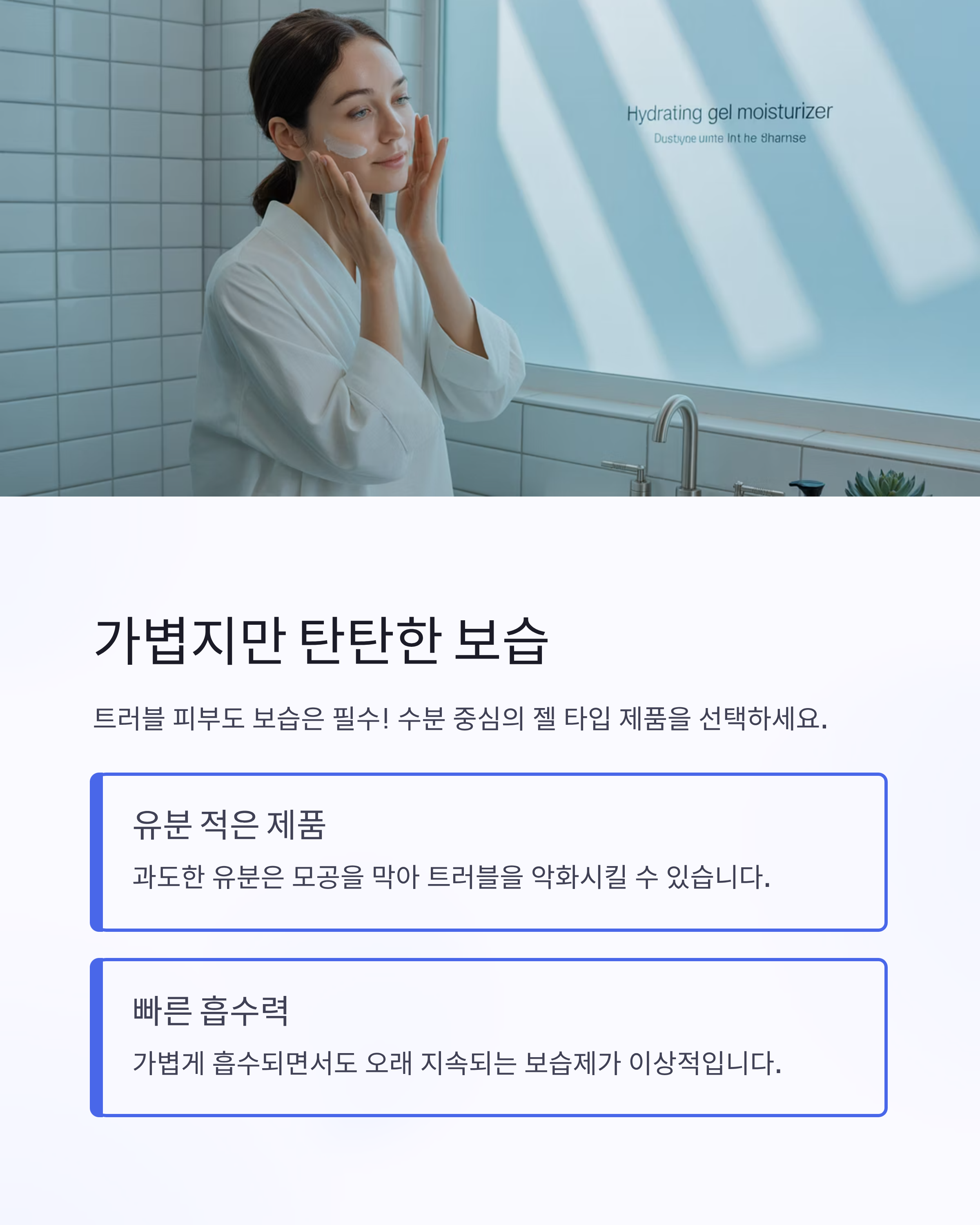 트러블 피부라도 보습을 소홀히 하면 더 악화될 수 있습니다.
