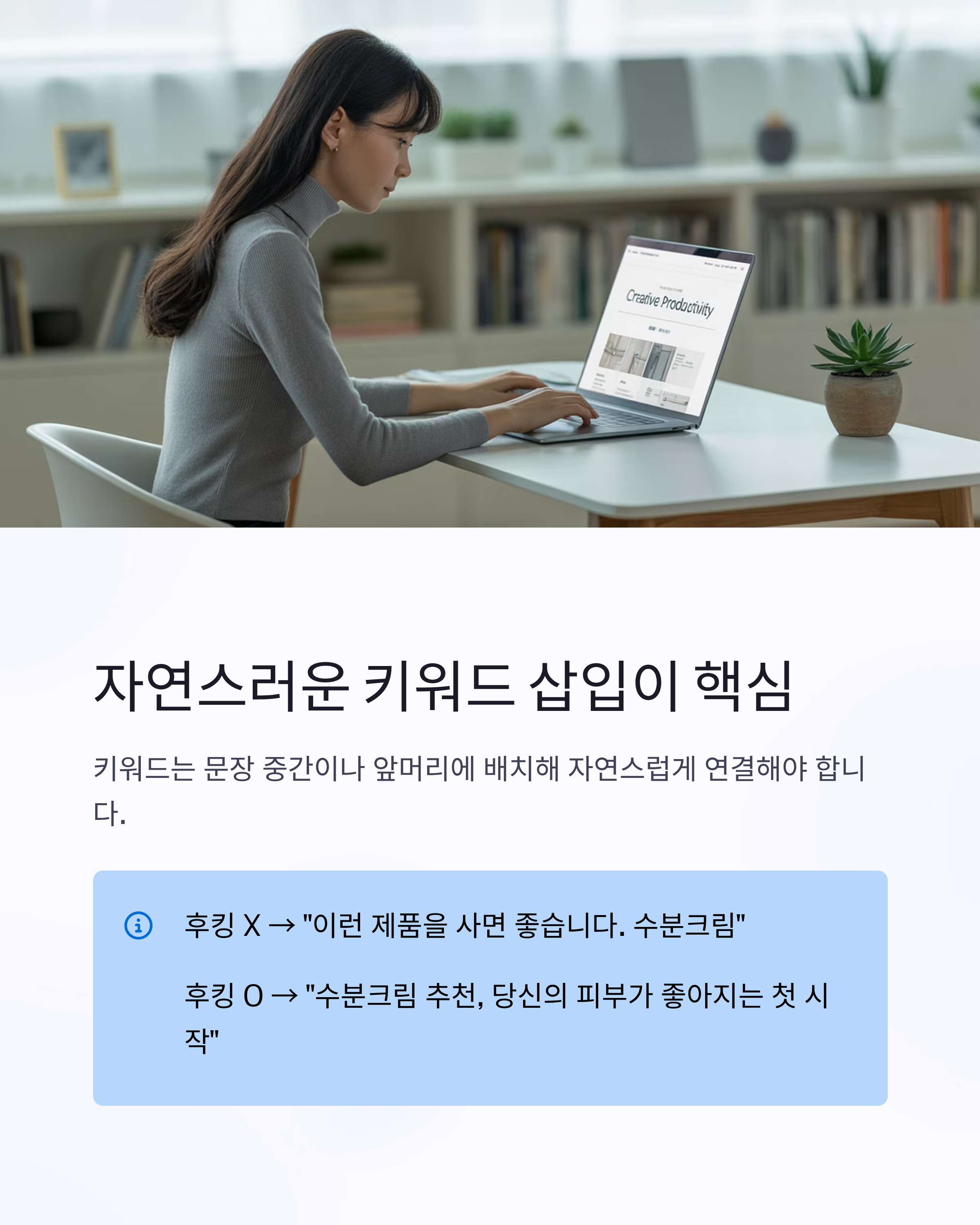 키워드는 문장 중간이나 앞머리에 배치해 자연스럽게 연결되게 해야 합니다.