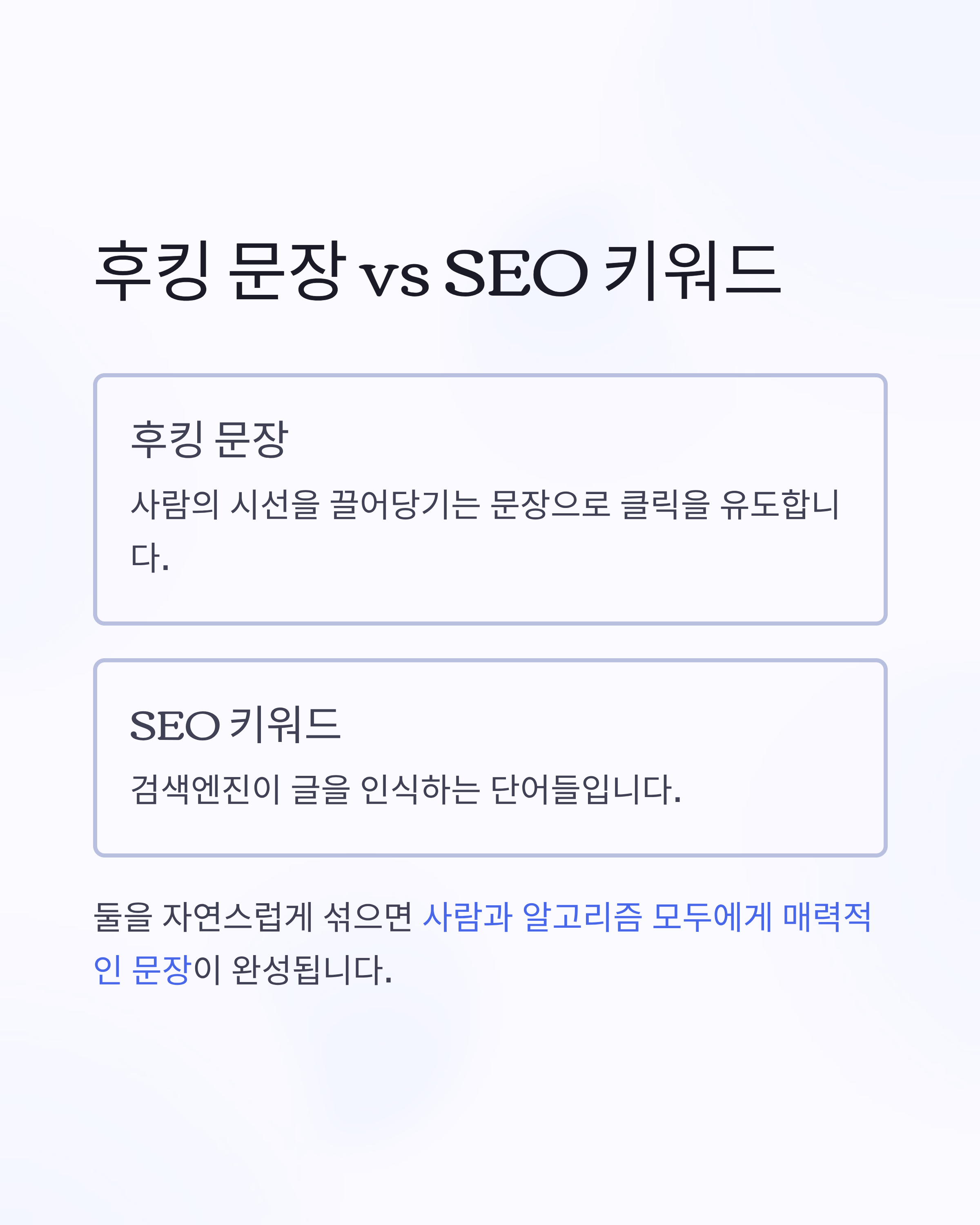 둘은 목적이 다르지만, 하나의 문장 안에 자연스럽게 섞이면 사람과 알고리즘 모두에게 매력적인 문장이 완성돼요.