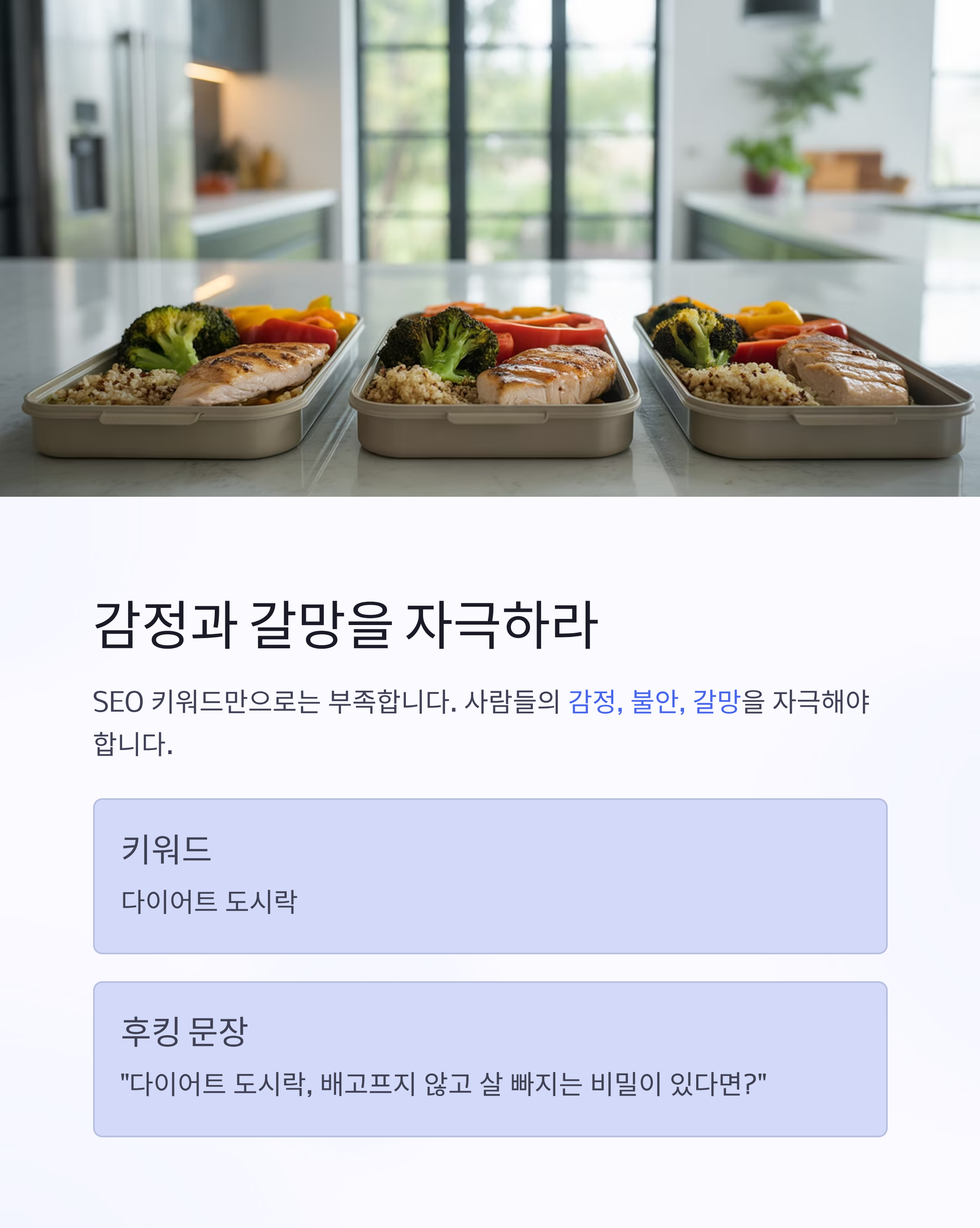 후킹 문장 → "다이어트 도시락, 배고프지 않고 살 빠지는 비밀이 있다면?"
