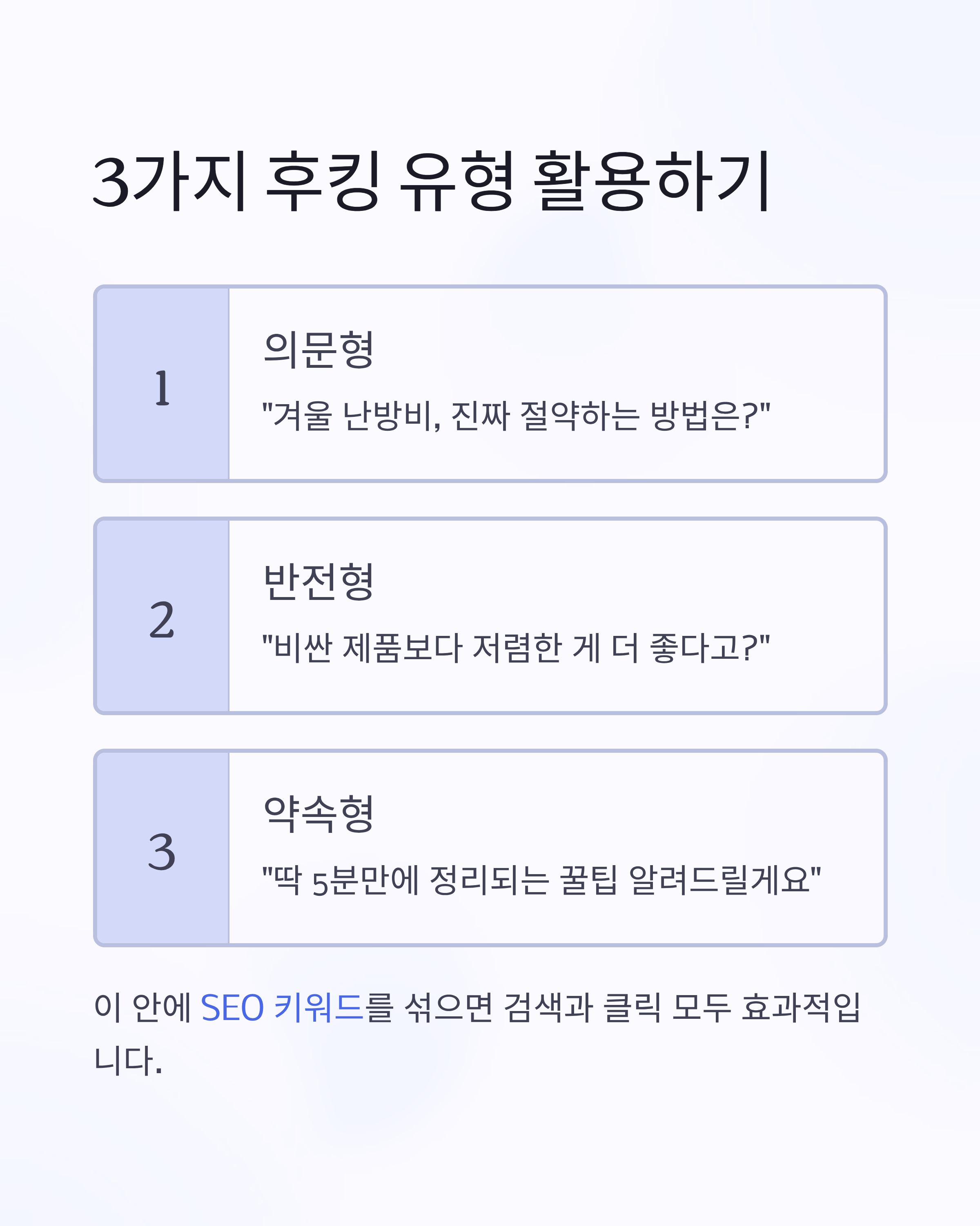 | 의문형 | 궁금증 자극 | "겨울 난방비, 진짜 절약하는 방법은?" |