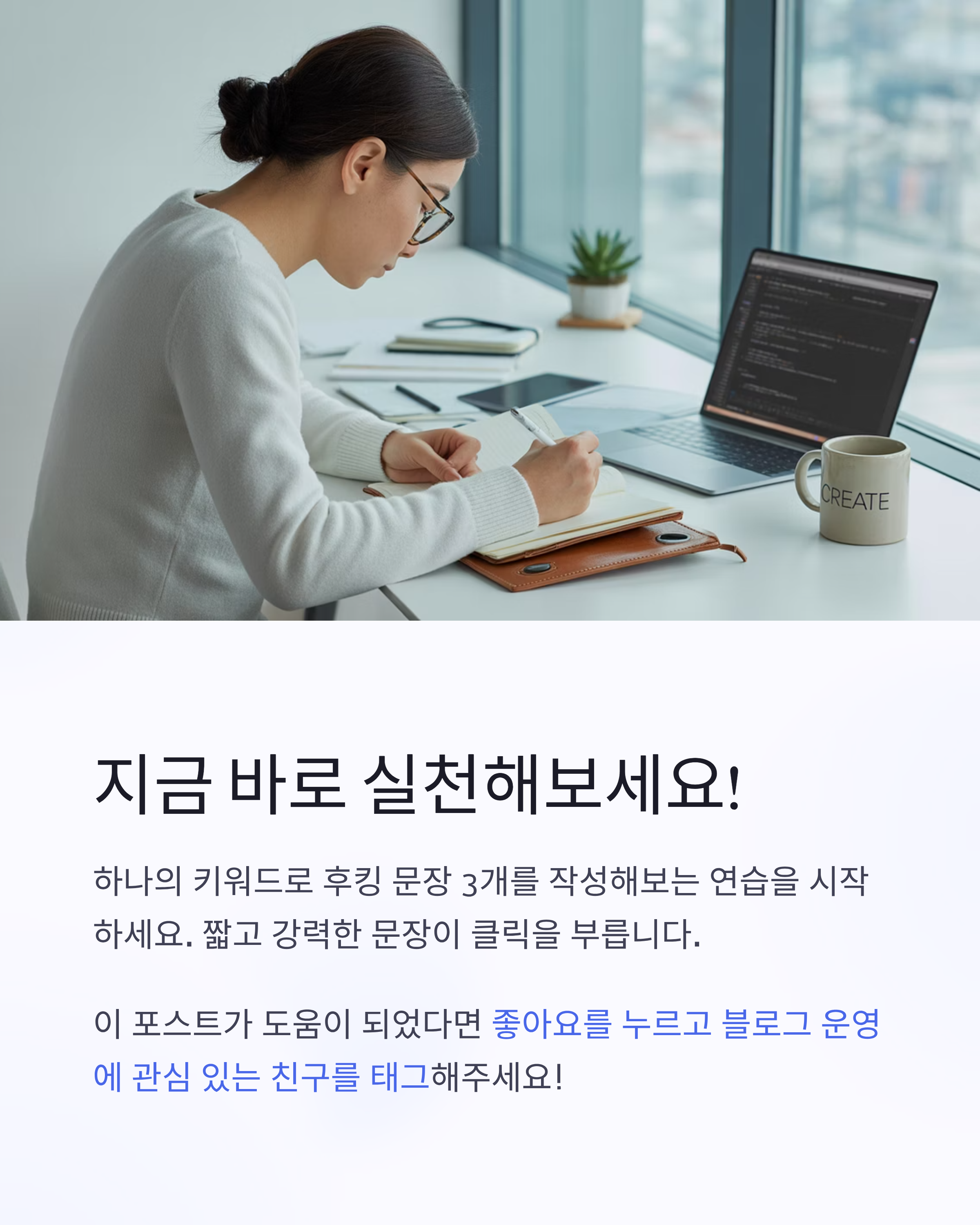 블로그 글을 쓸 때 읽는 사람의 시선을 끌면서도 검색엔진에 노출되려면, 한 문장 안에 ‘후킹 요소’와 ‘SEO 키워드’를 동시에 담는 센스가 필요합니다. 이번 글에서는 클릭을 유도하는 강력한 문장 안에 어떻게 자연스럽게 키워드를 심을 수 있는지, 실제 예시와 함께 알려드릴게요.