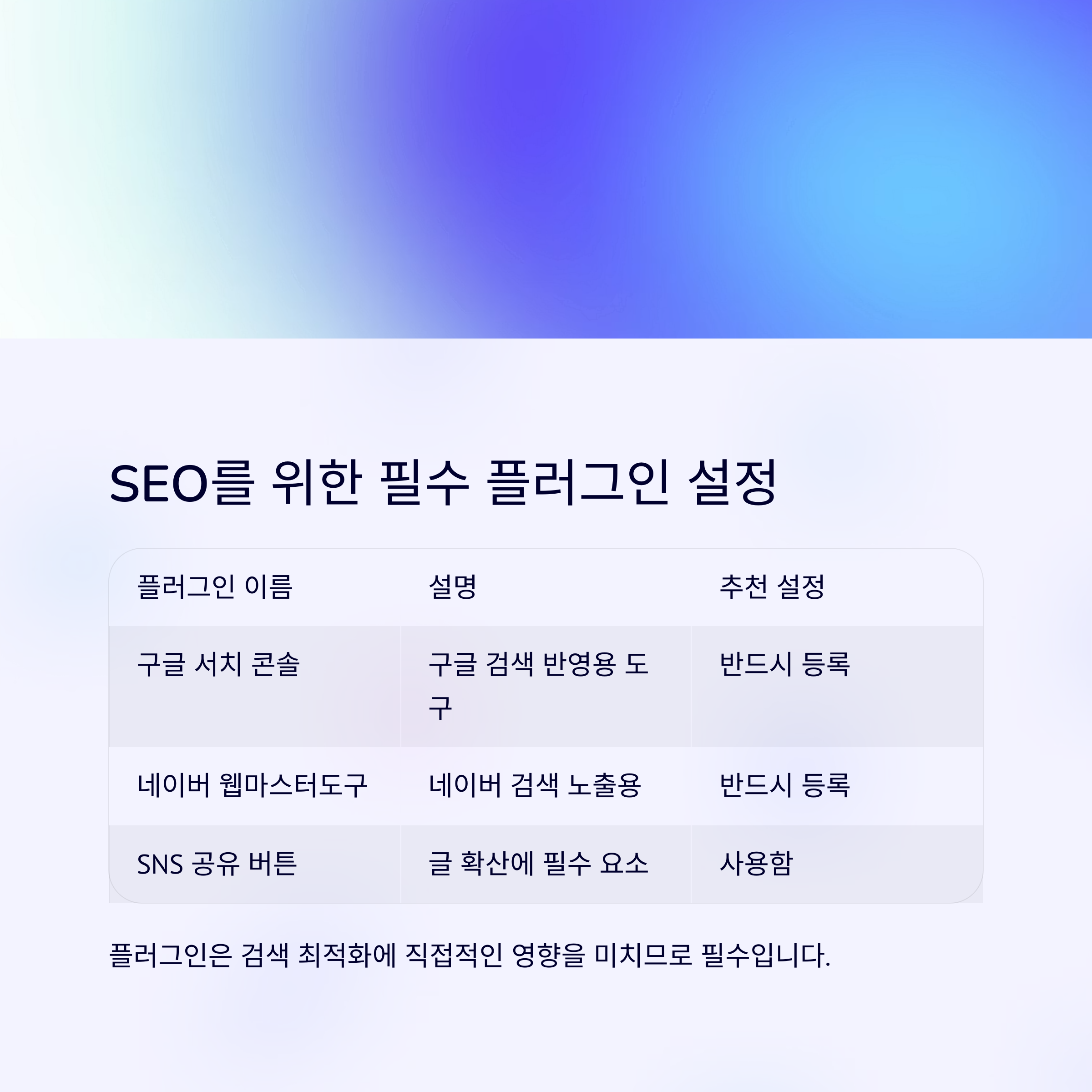 아래 표처럼 플러그인은 검색 최적화에 직접적인 영향을 미치기 때문에 반드시 설정하세요