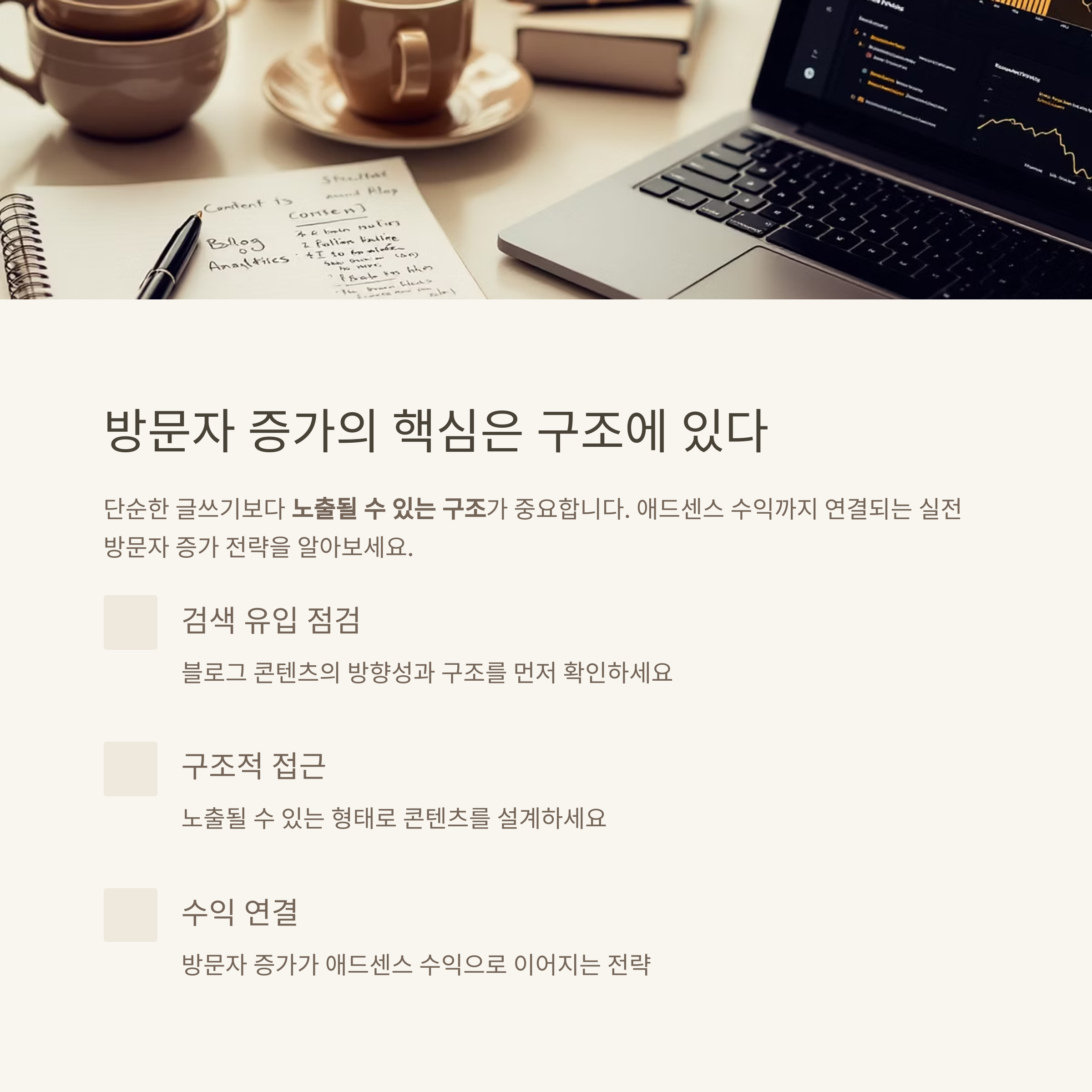 이번 글에서는 애드센스 수익까지 연결될 수 있는 실전 방문자 증가 전략 7가지를 소개합니다