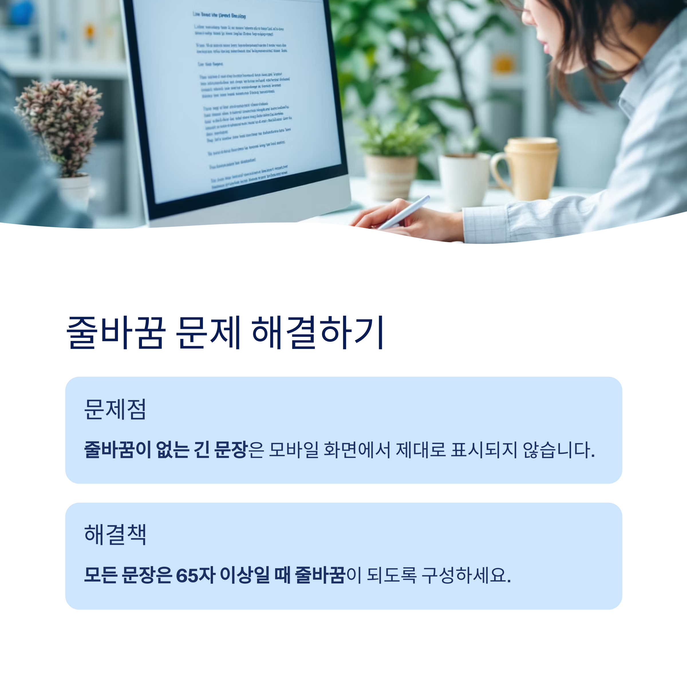 모든 문장은 65자 이상일 때 줄바꿈이 되도록 구성하는 것이 핵심입니다.
