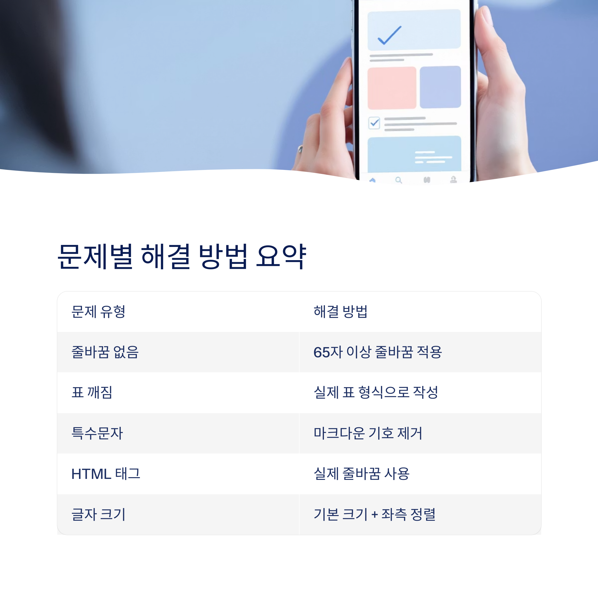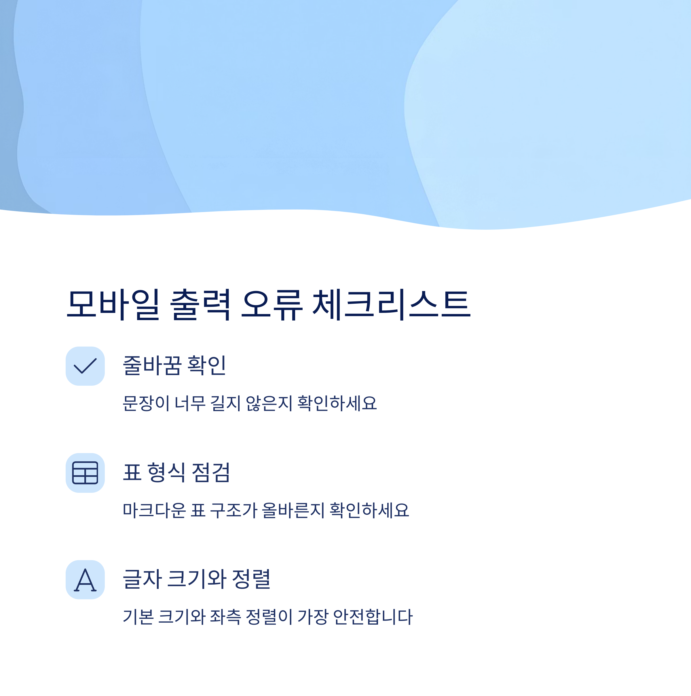 모바일에서 글이 비정상적으로 출력된다면, 다음 요소들을 반드시 확인해보셔야 합니다.