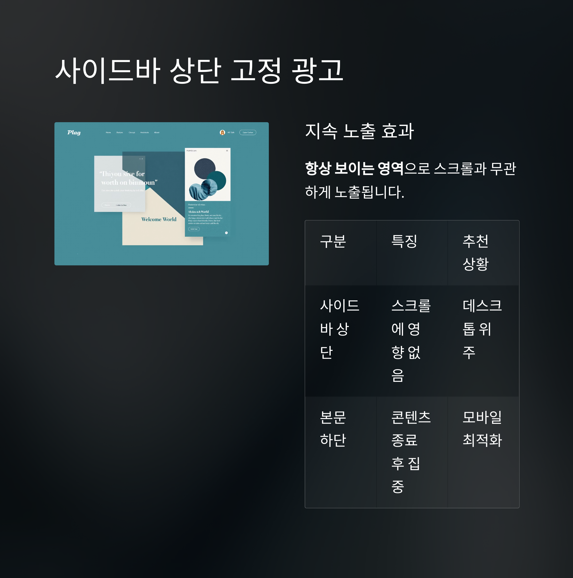 | 사이드바 상단 | 스크롤에 영향 없음 | 데스크톱 위주 사이트 |