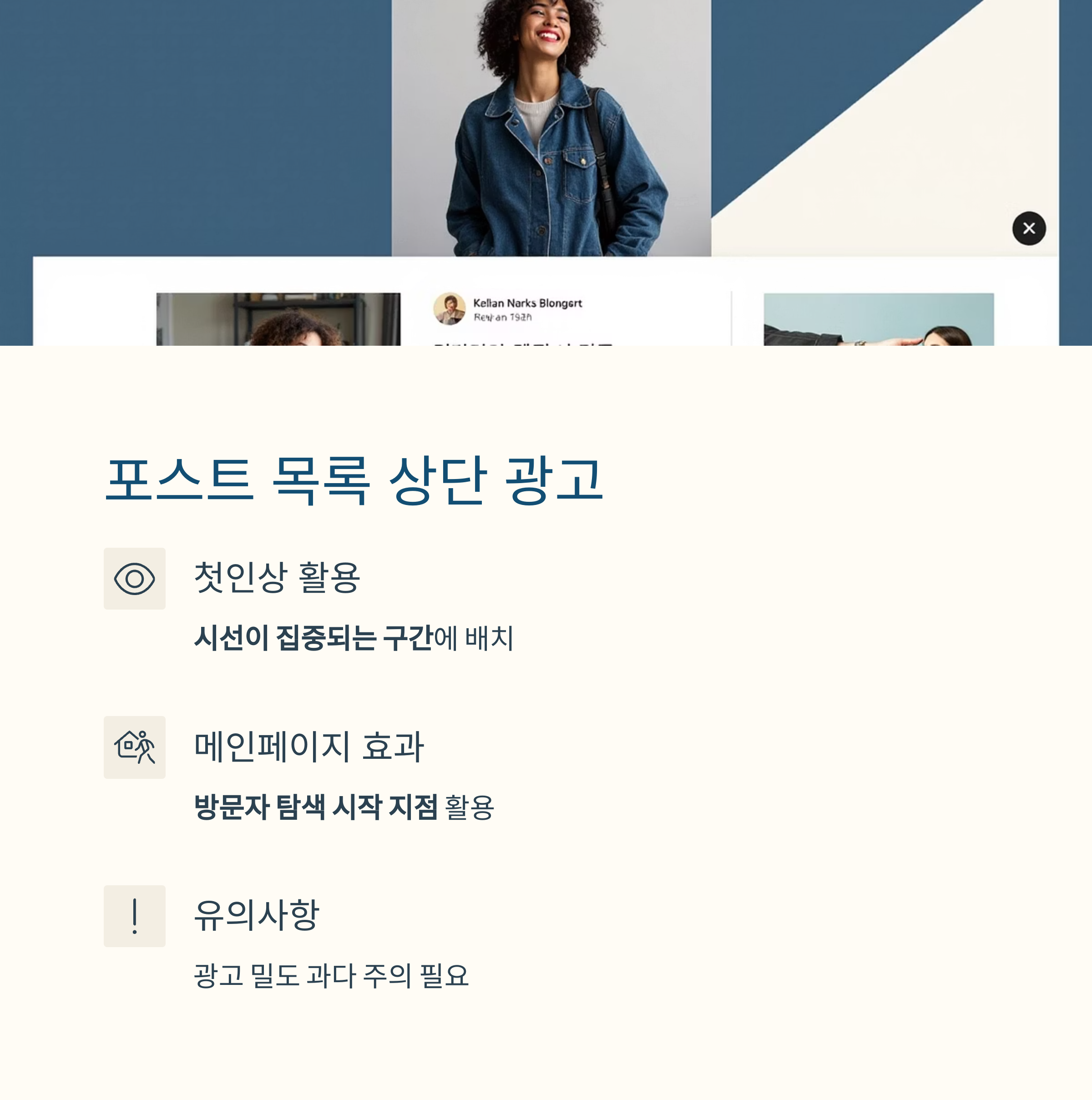| 포스트 목록 상단 | 방문 초반 노출 | 광고 밀도 과다 주의 |