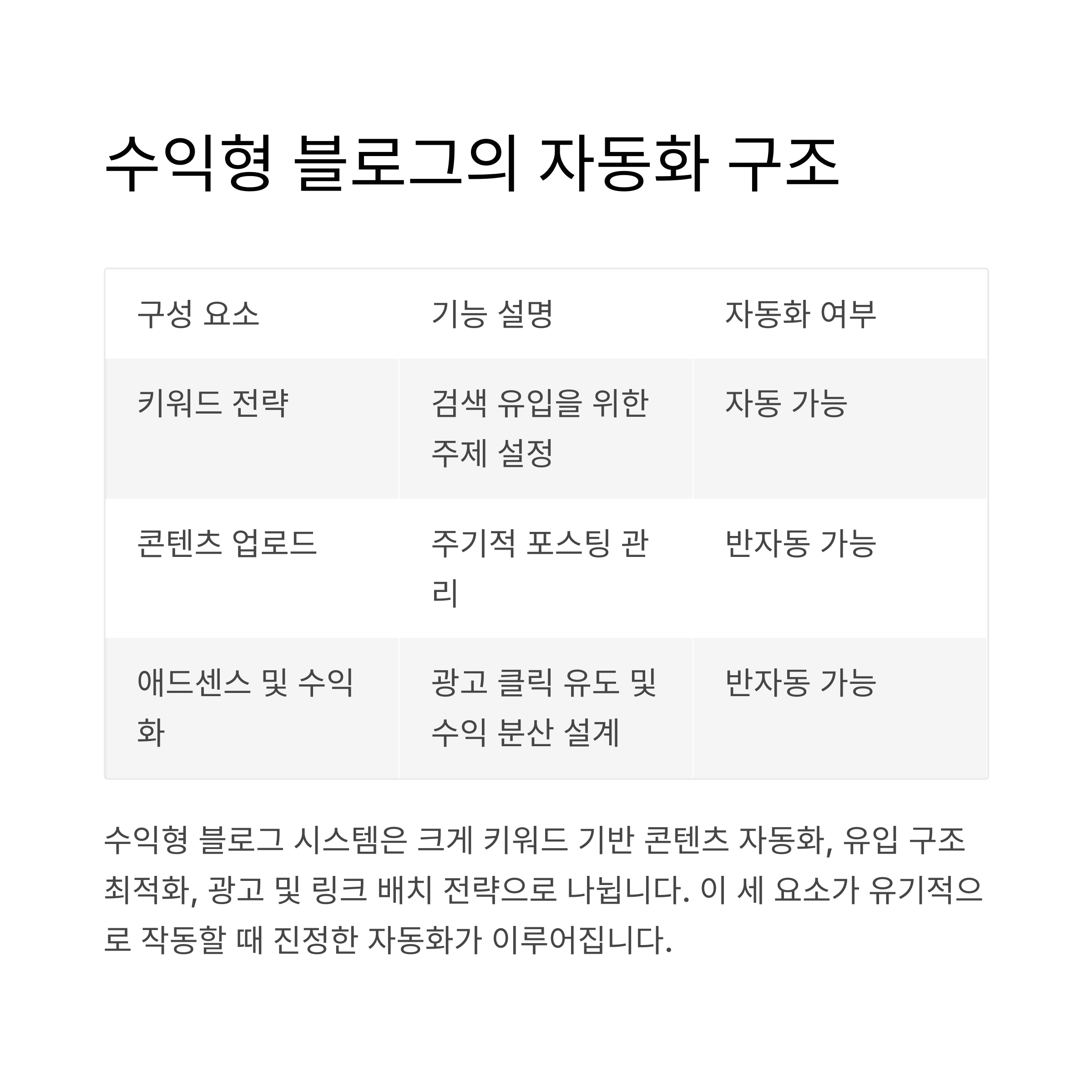 아래 표는 블로그 자동화의 핵심 3요소를 정리한 것입니다