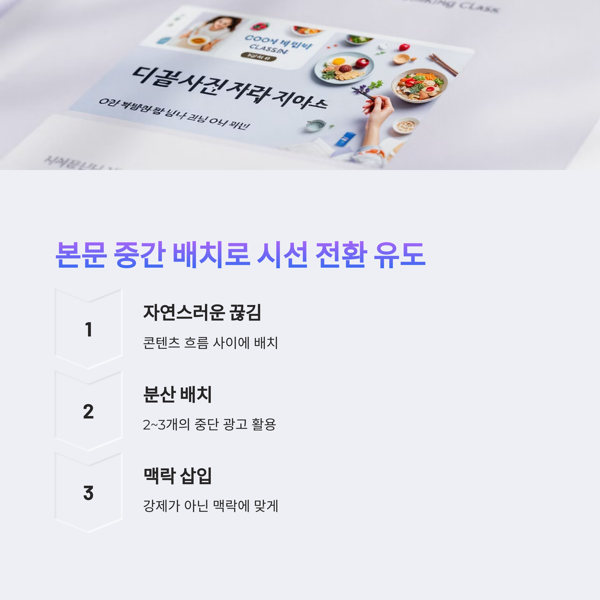 특히 긴 글일수록 이 전략이 효과적이며, 2~3개의 중단 광고를 분산 배치하면 평균 클릭률이 높아집니다