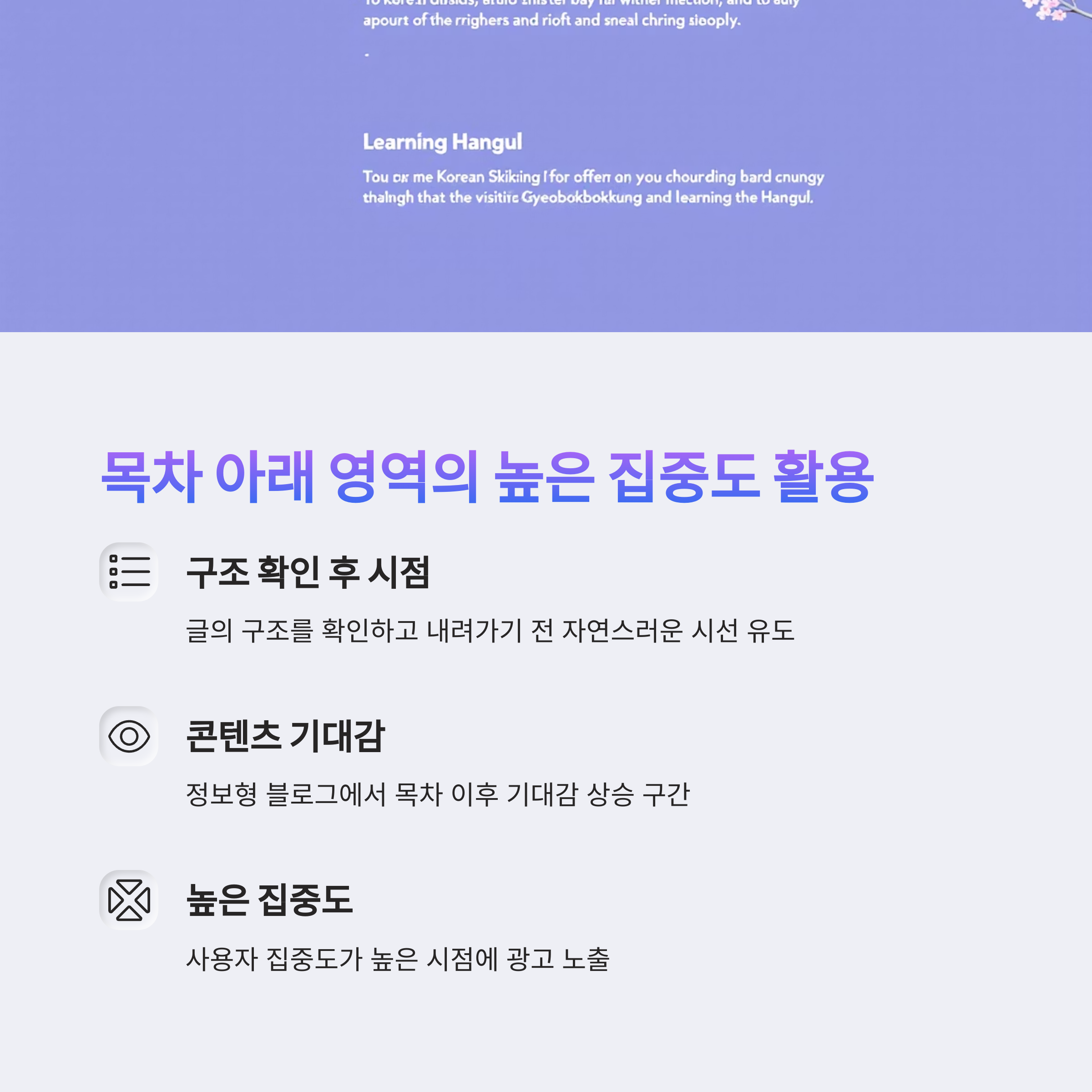 특히 정보형 블로그에서는 목차 이후가 콘텐츠 기대감이 상승하는 구간이므로
