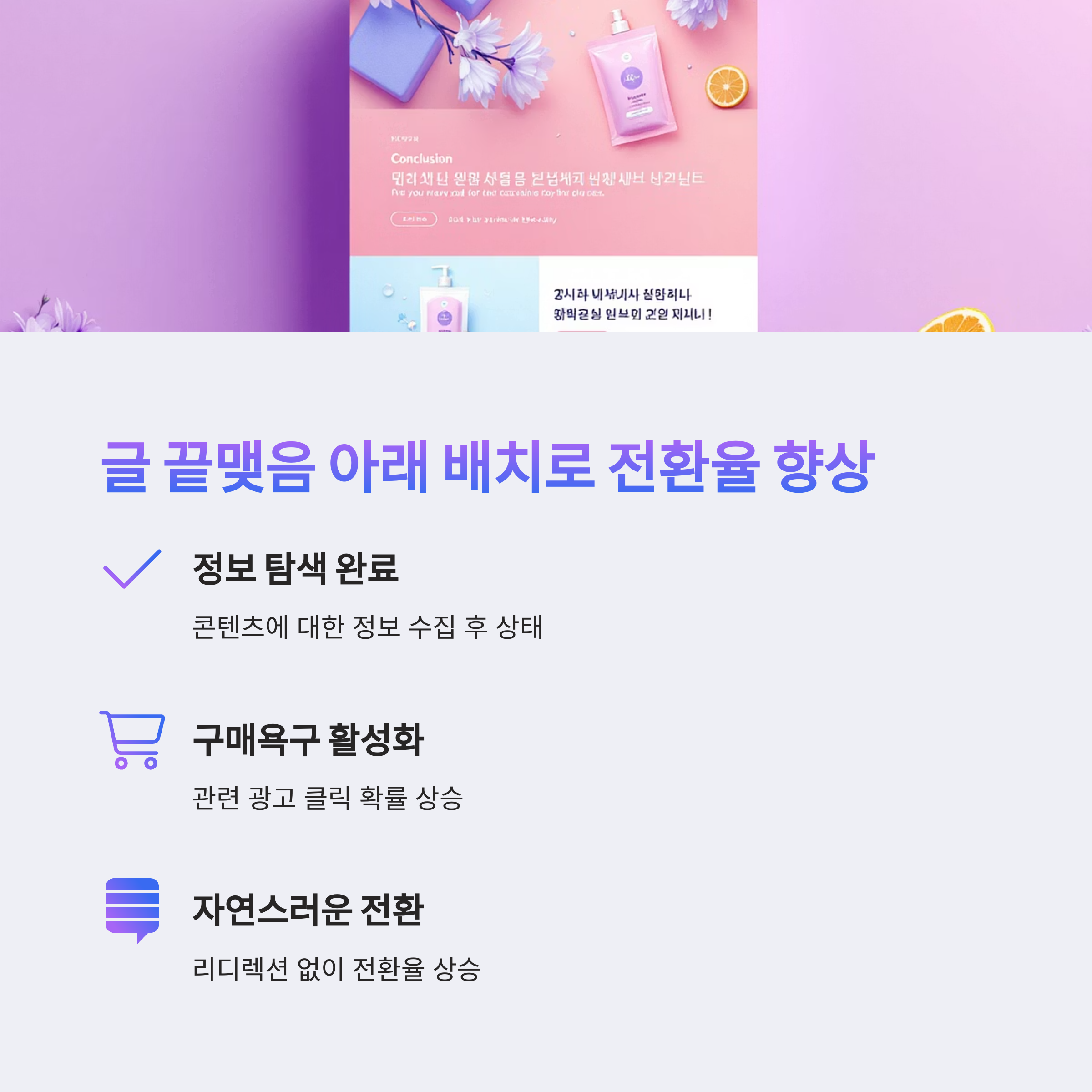 사용자가 본문을 읽기 전 광고를 한 번 더 스캔하게 되어 노출 대비 수익률이 뛰어납니다