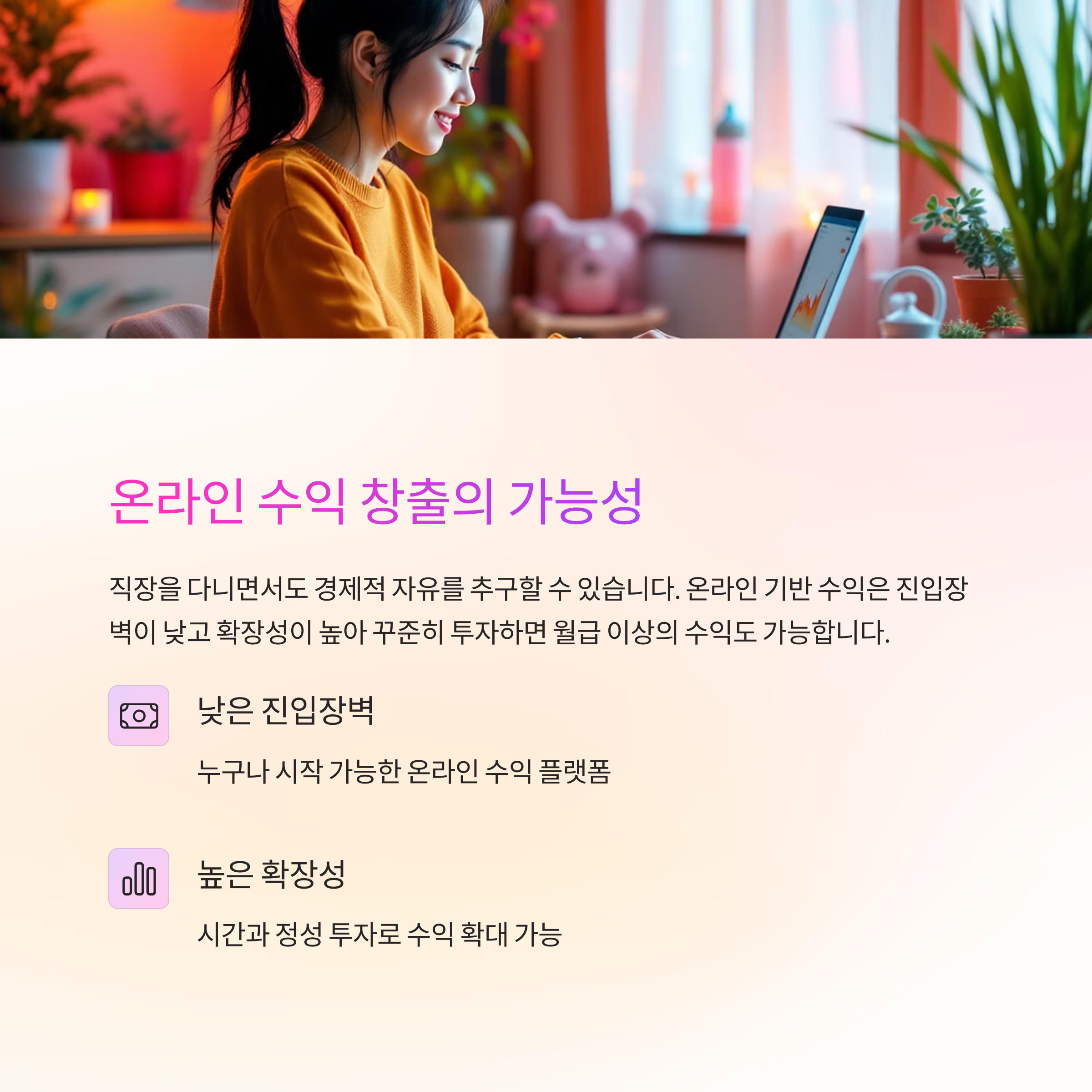 특히 온라인 기반의 수익 창출은 진입장벽이 낮고 확장성이 높아