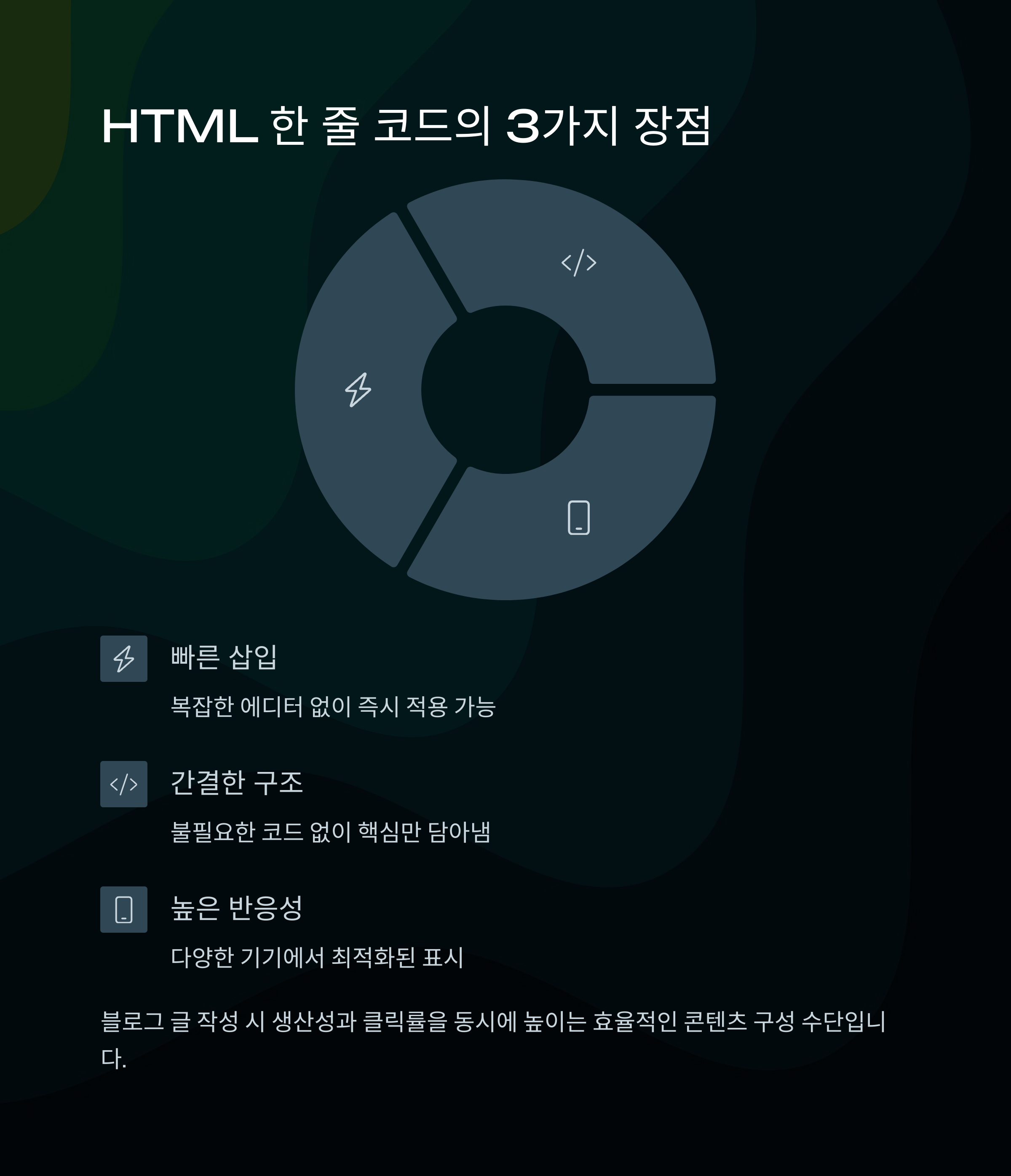 복잡한 에디터 사용 대신 HTML 한 줄로 더 빠르게 구성할 수 있습니다.