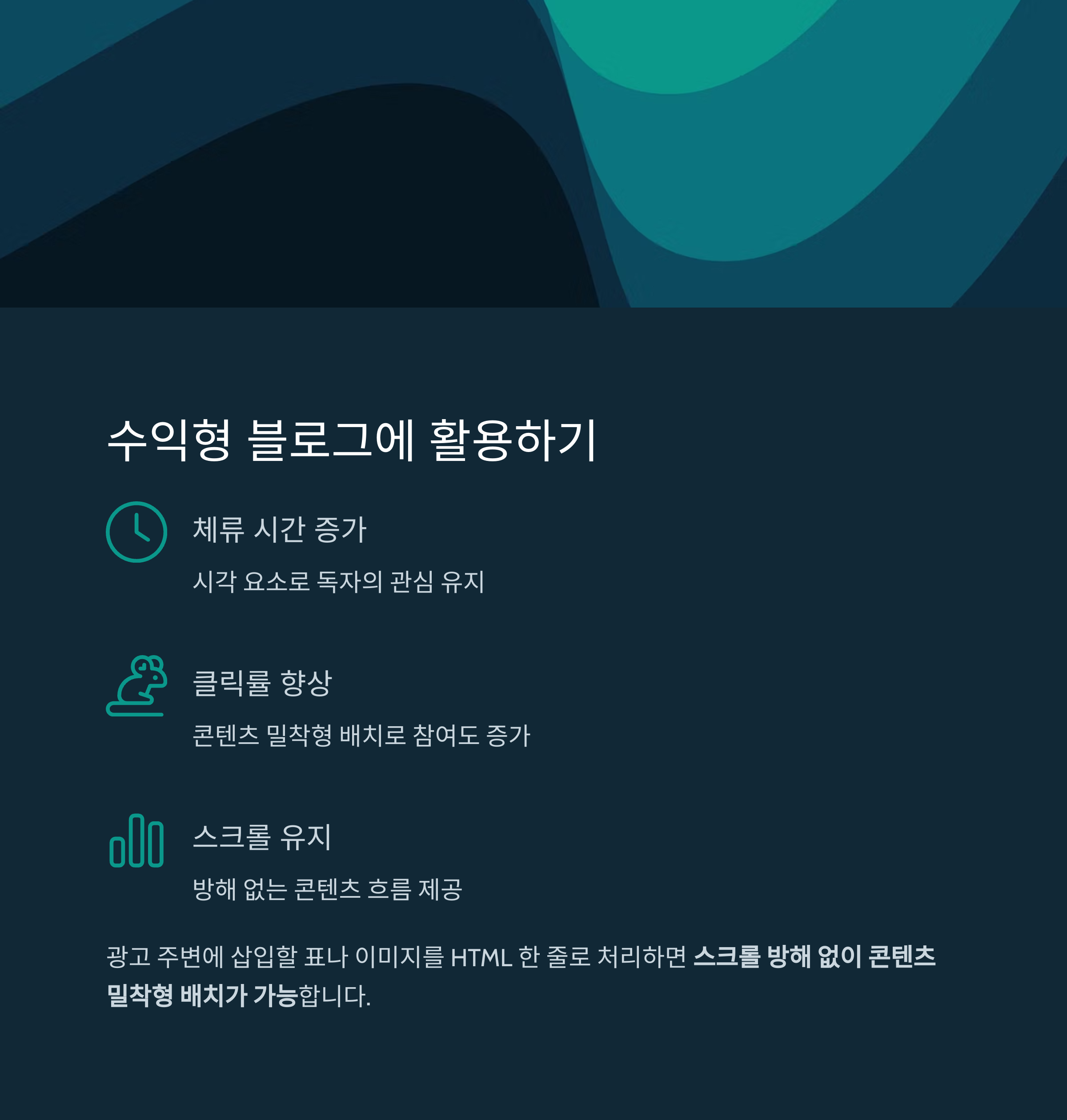 스크롤 방해 없이 콘텐츠 밀착형 배치가 가능합니다.