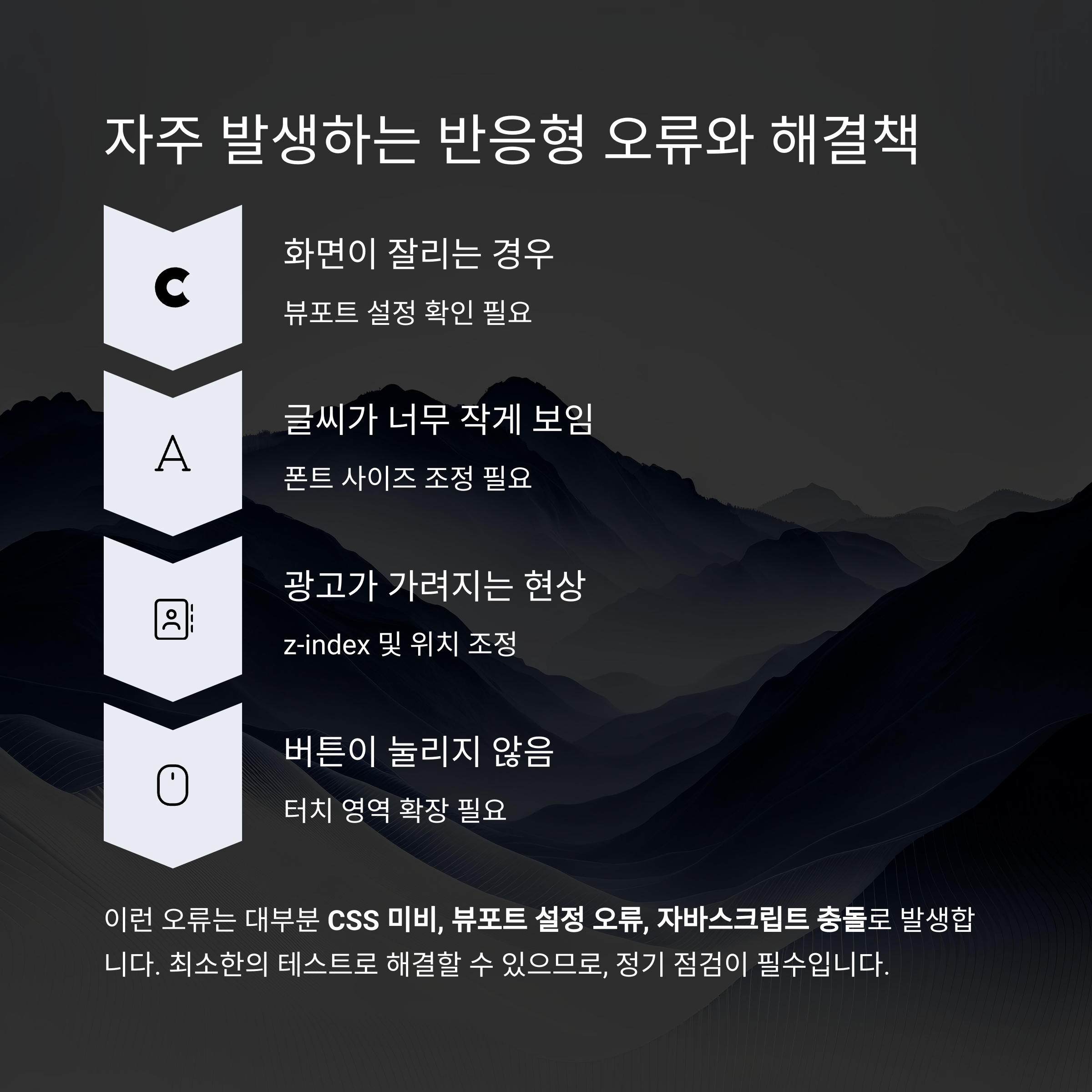 이런 오류는 대부분 CSS 미비, 뷰포트 설정 오류, 자바스크립트 충돌로 발생합니다
