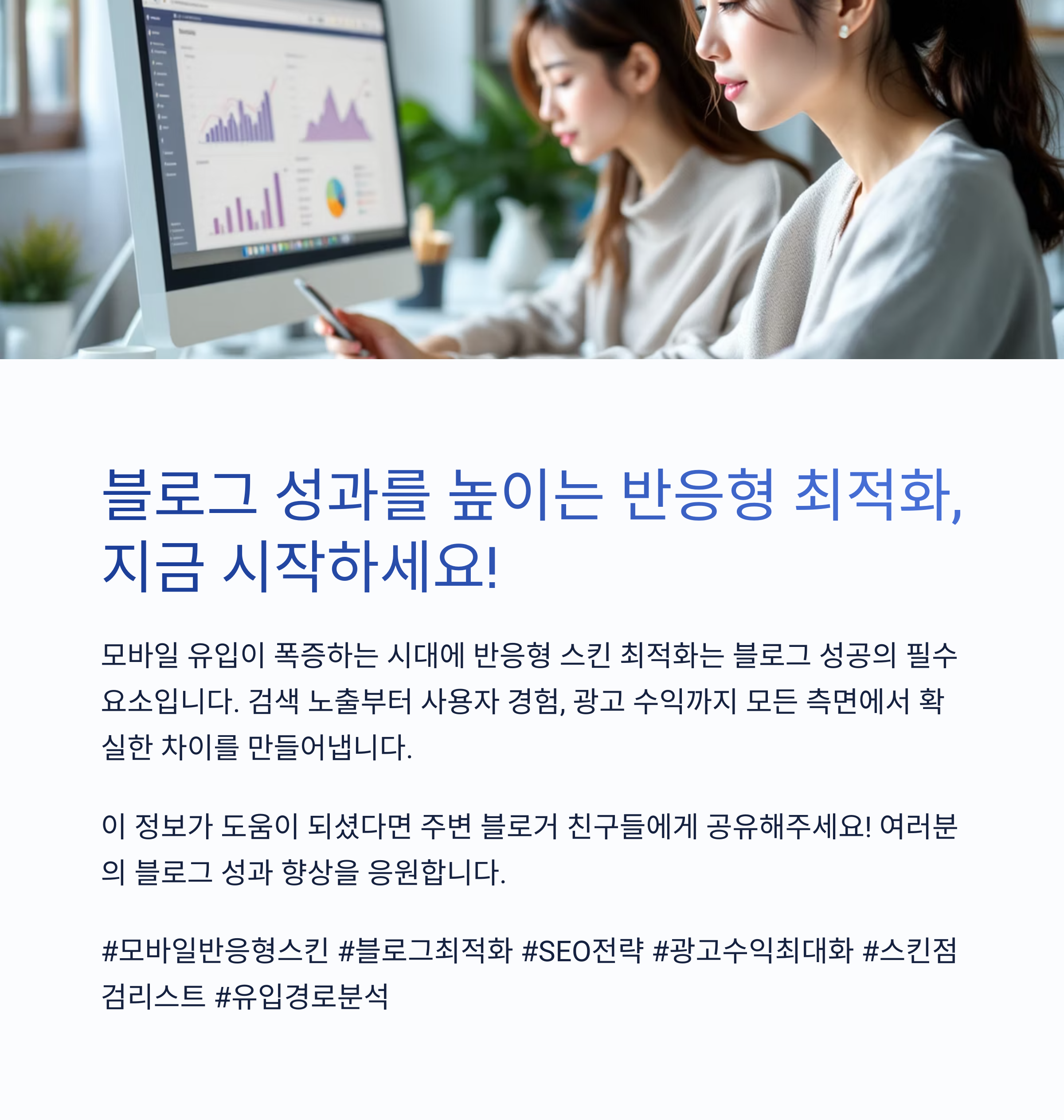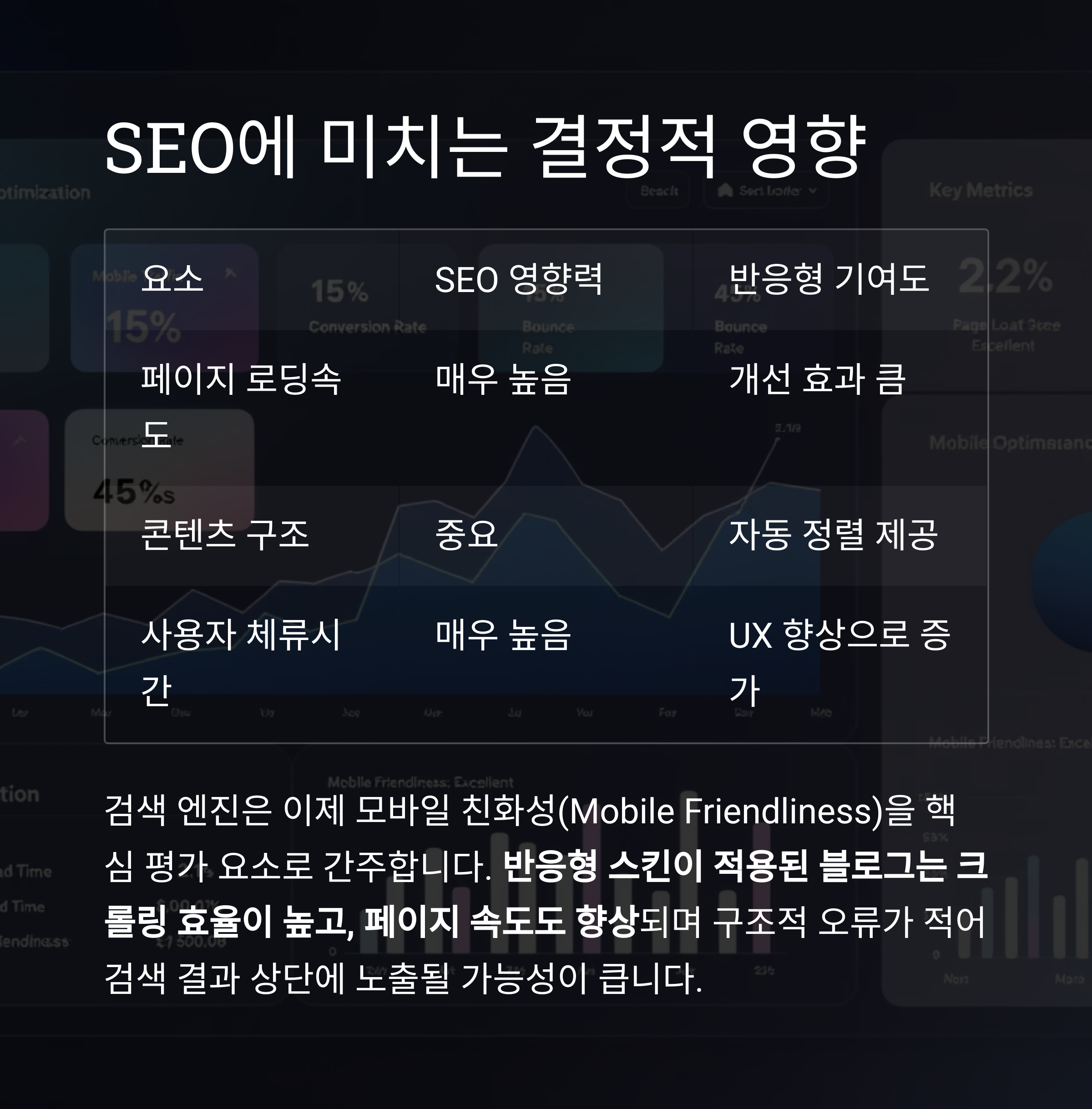 모바일 UX를 고려한 반응형 스킨 구축은 **검색 최적화(SEO)**의 핵심입니다.