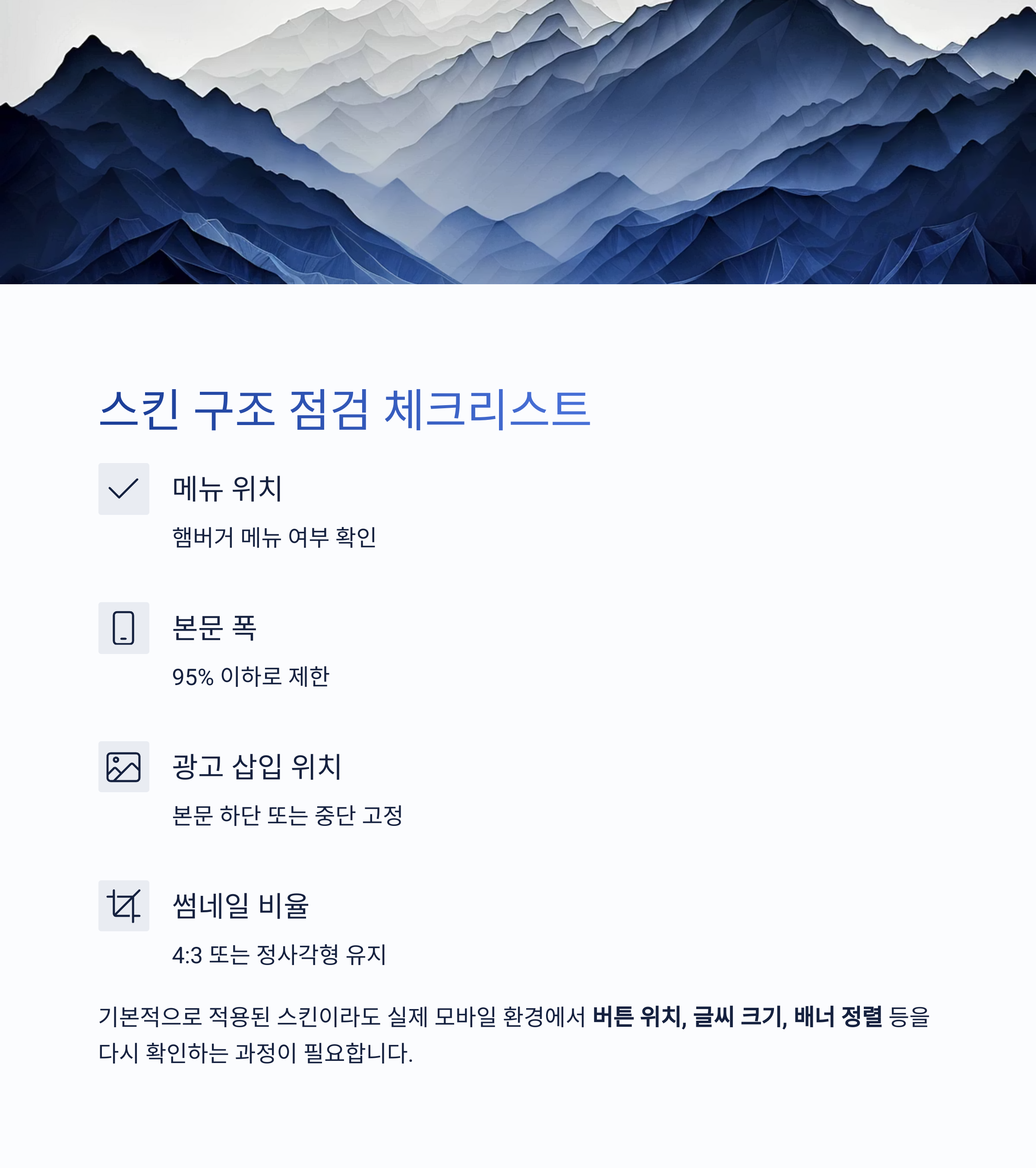 기본적으로 적용된 스킨이라도 실제 모바일 환경에서 버튼 위치, 글씨 크기, 배너 정렬 등을