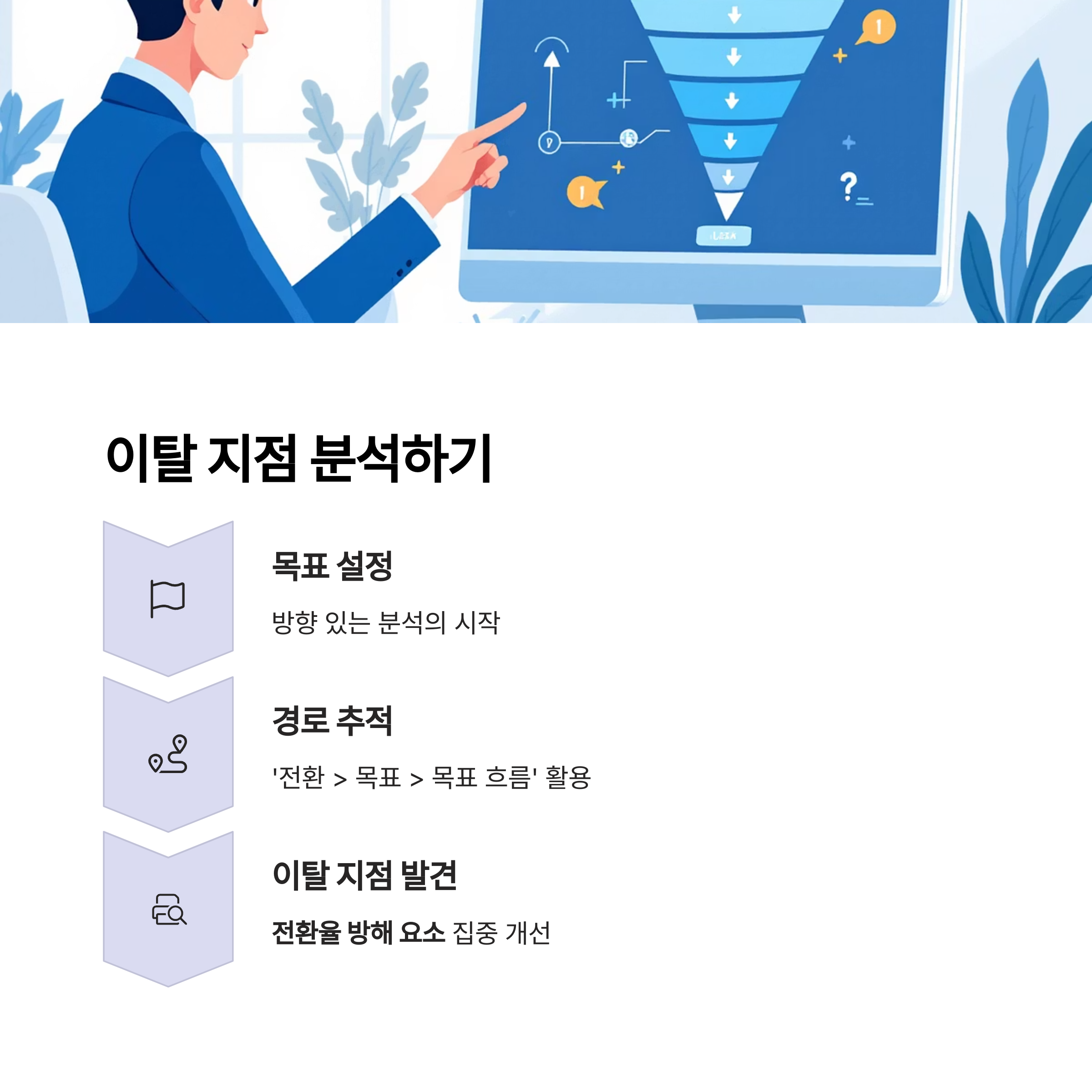 방문자가 어떤 경로를 통해 전환하거나, 어디서 이탈하는지 시각적으로 확인할 수 있습니다
