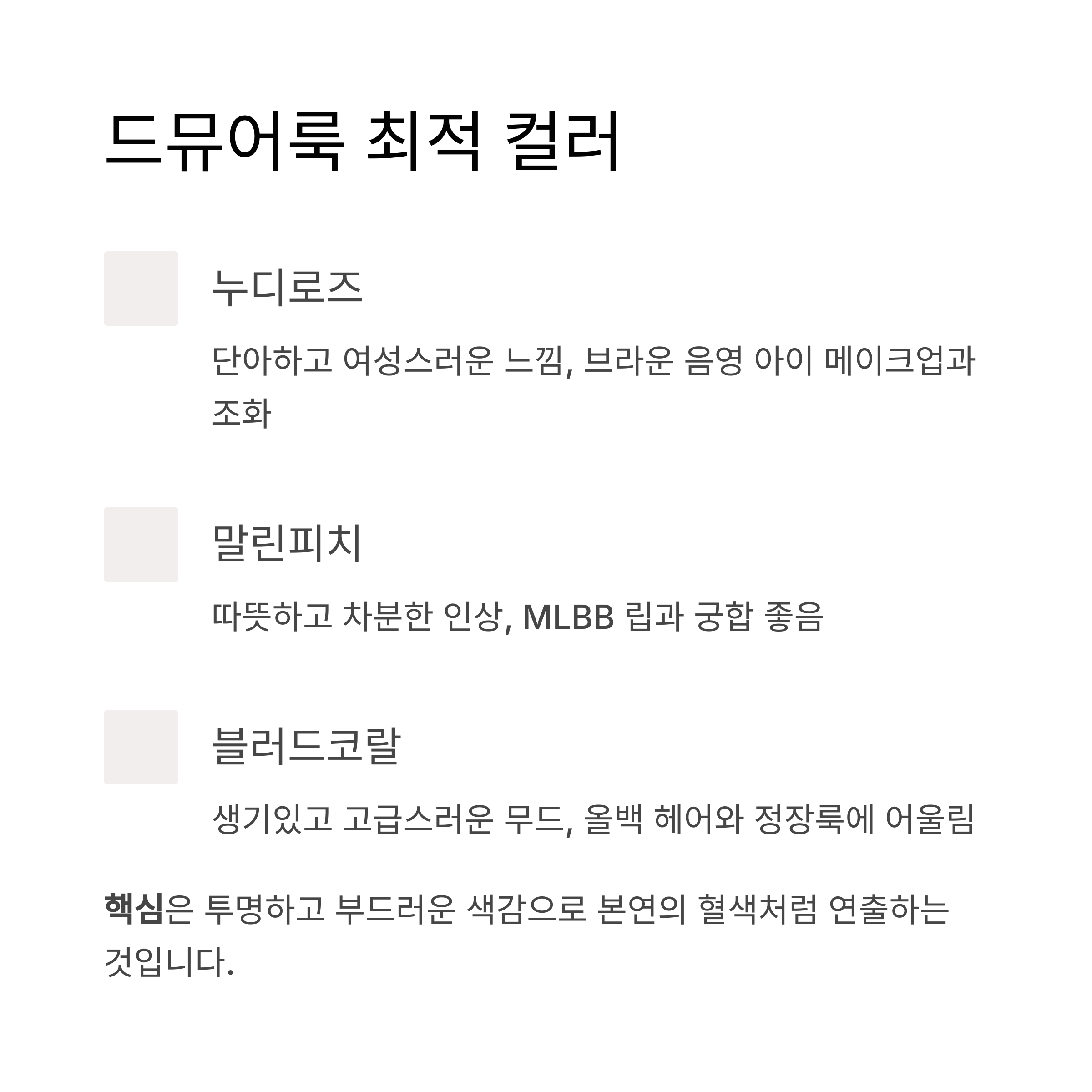| 말린피치 | 따뜻하고 차분한 인상 | MLBB 립과 궁합 좋음 |