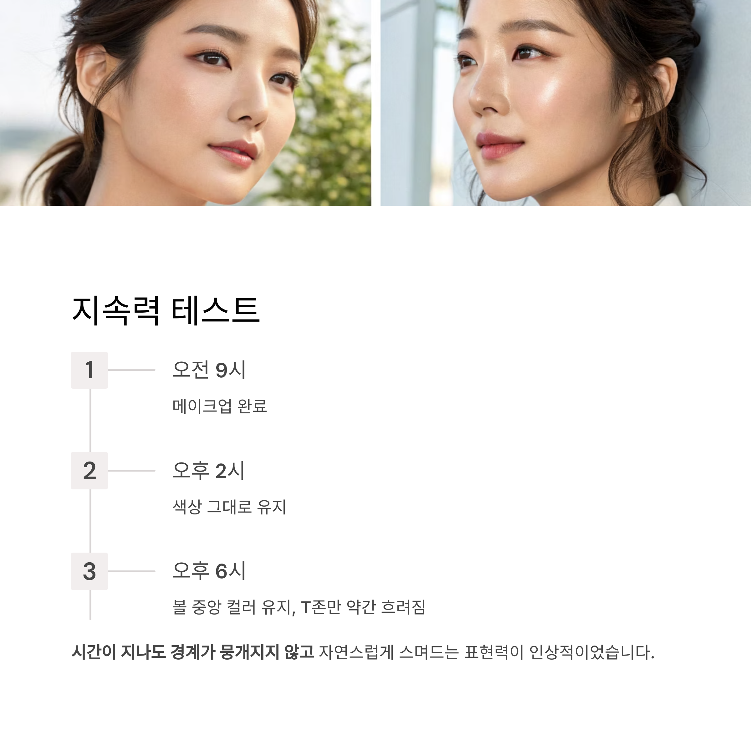 | 밀착력 | 4.5점 | 약간의 유분기에도 잘 유지됨 |