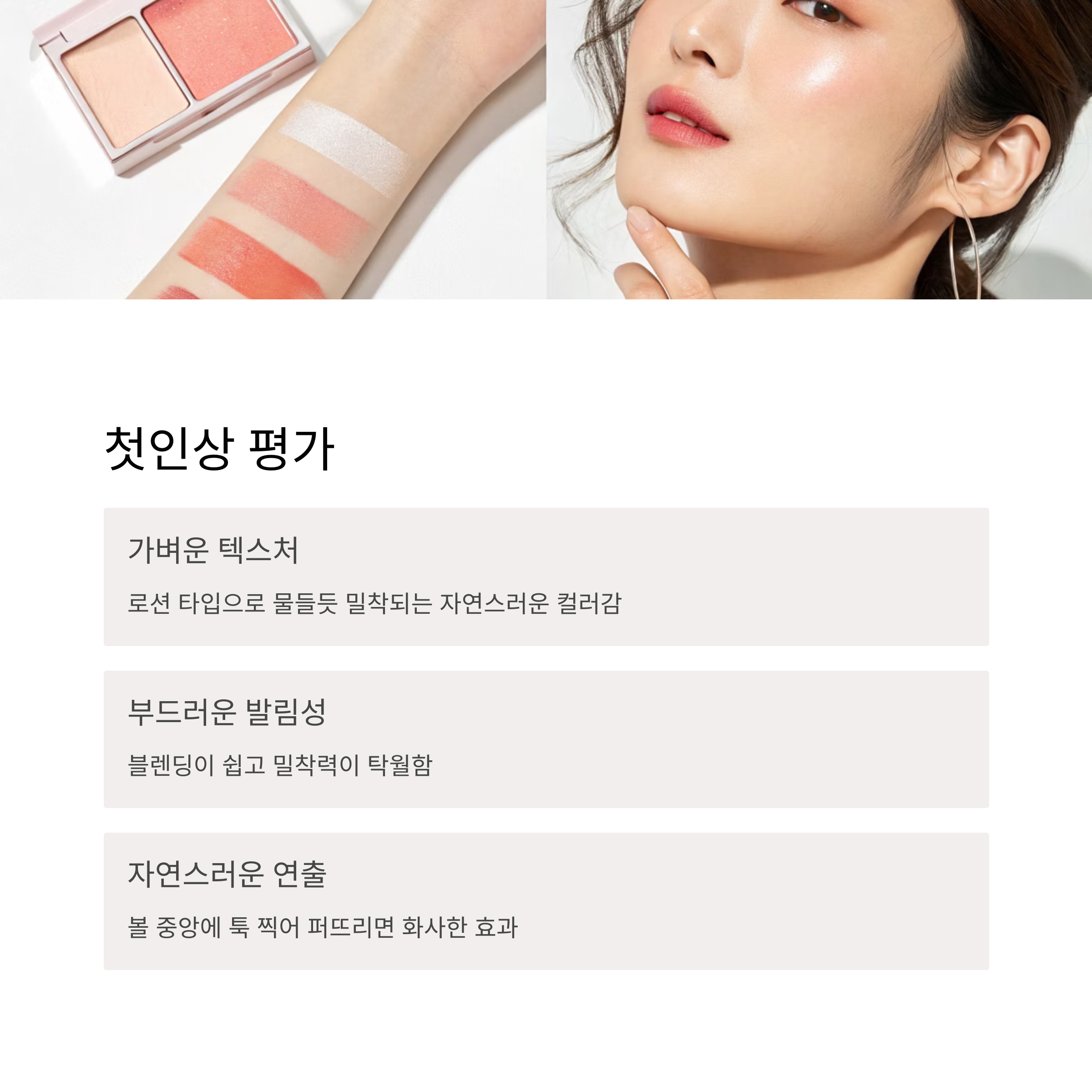 파운데이션 위에 올려도 들뜨지 않고 컬러가 은은하게 올라옵니다.
