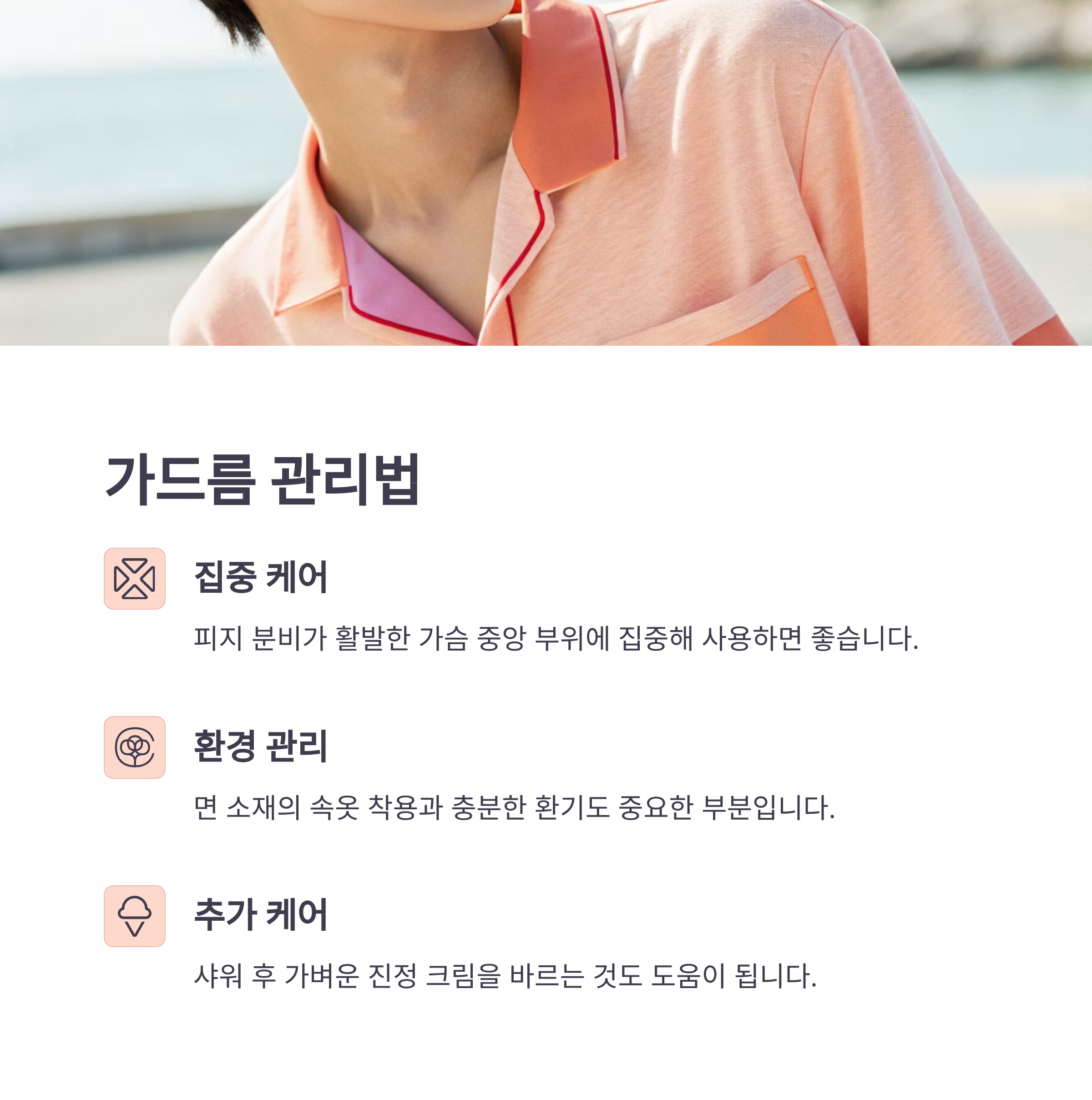 피지 분비가 활발한 가슴 중앙 부위에 집중해 사용하면 좋습니다