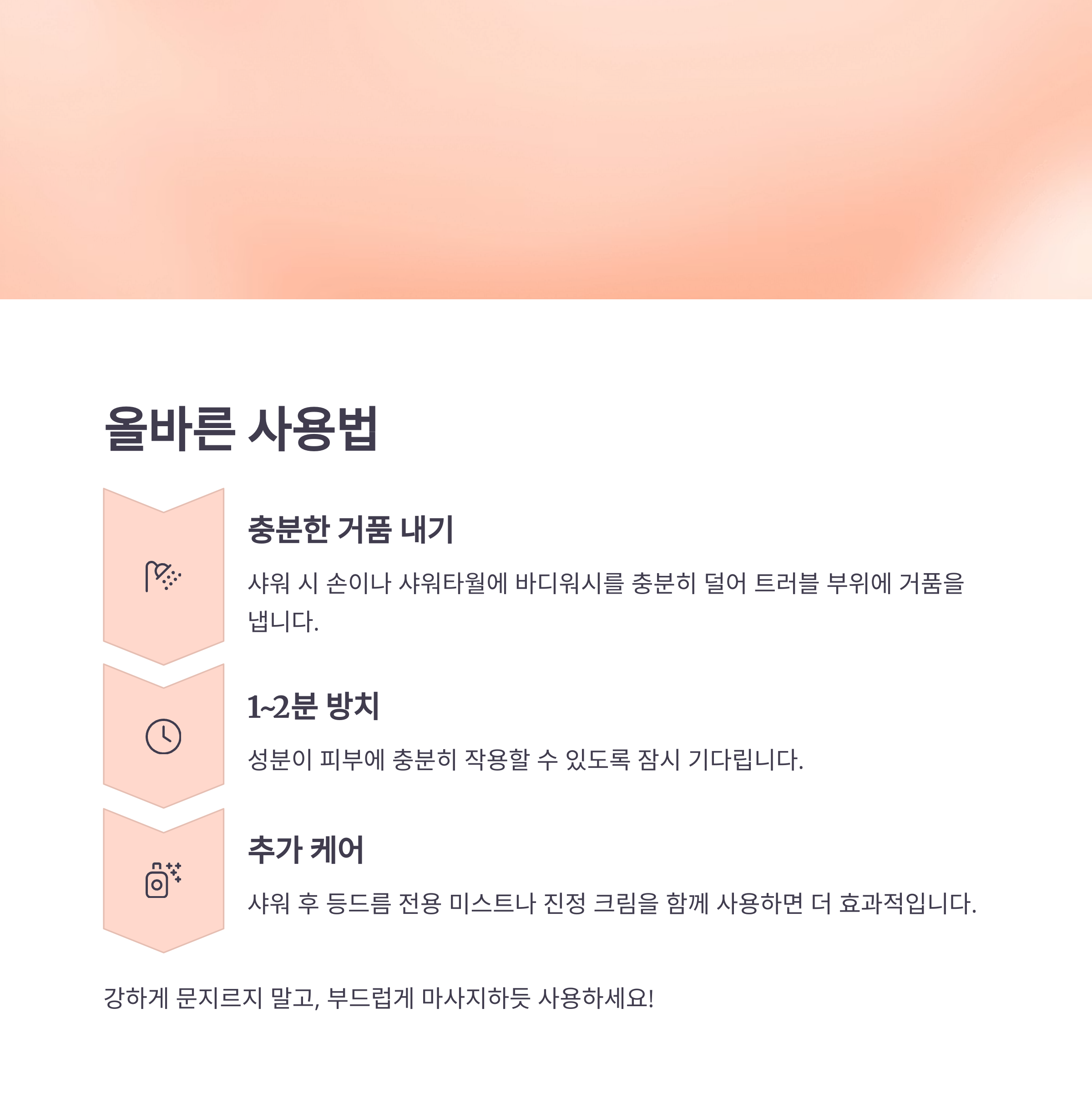 | 샤워 후 바디워시 | 부드럽게 마사지 후 1~2분 방치 | 하루 1회 |