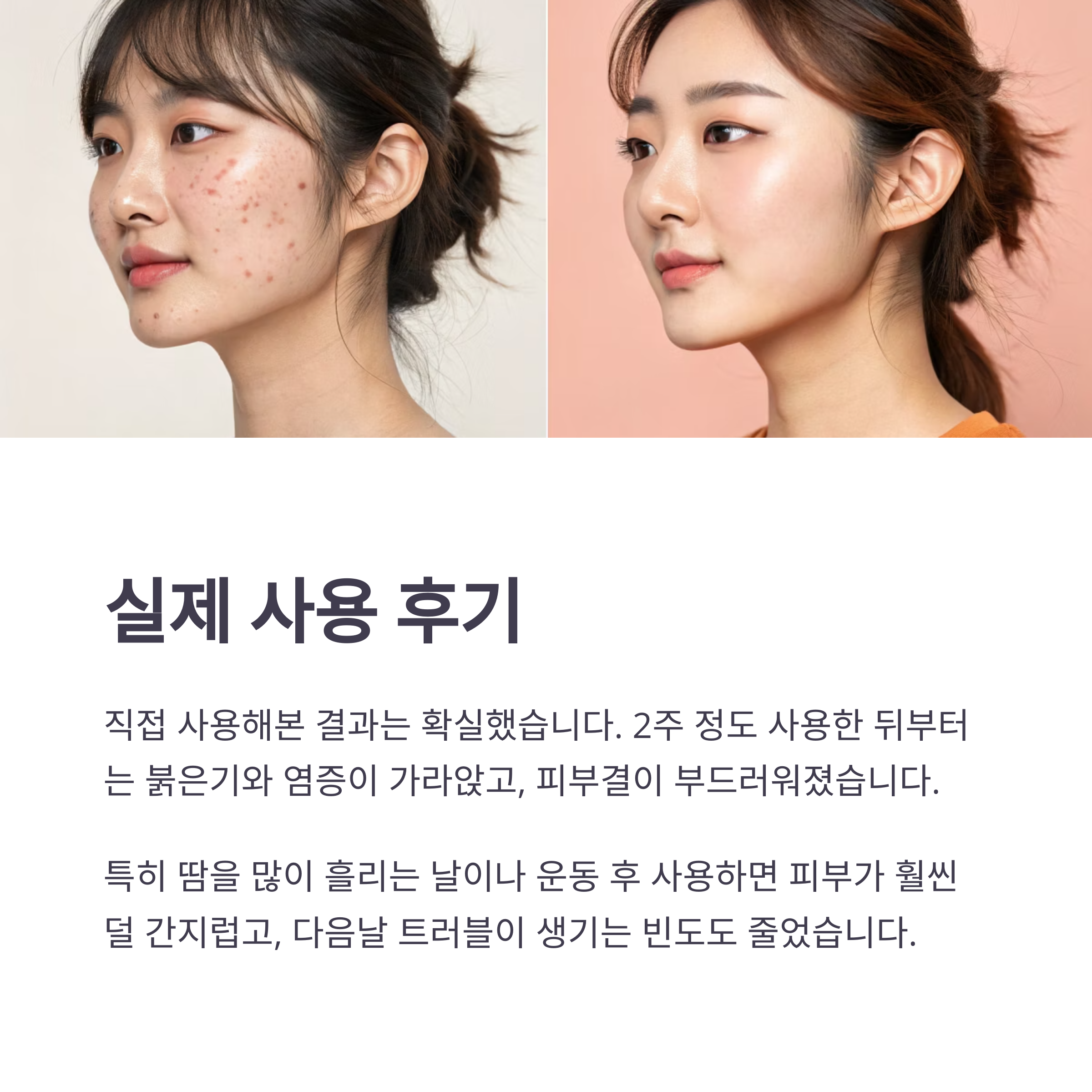 2주 정도 사용한 뒤부터는 붉은기와 염증이 가라앉고, 피부결이 부드러워졌습니다