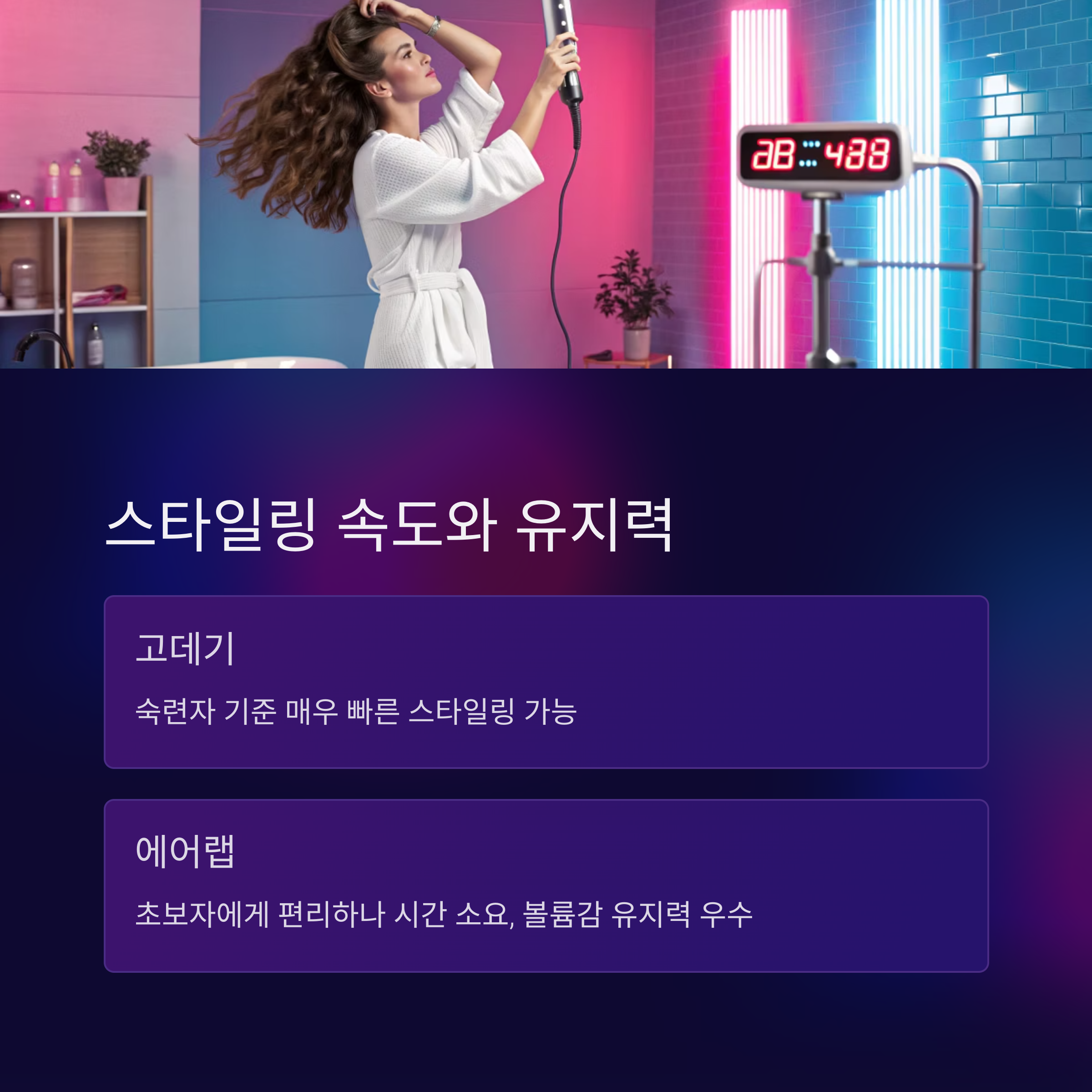 하지만 정교한 스타일이 필요한 경우, 특히 내추럴한 웨이브나 뿌리 볼륨 연출에서는 에어랩이 더 자연스럽고 세련된 결과를 보여줍니다