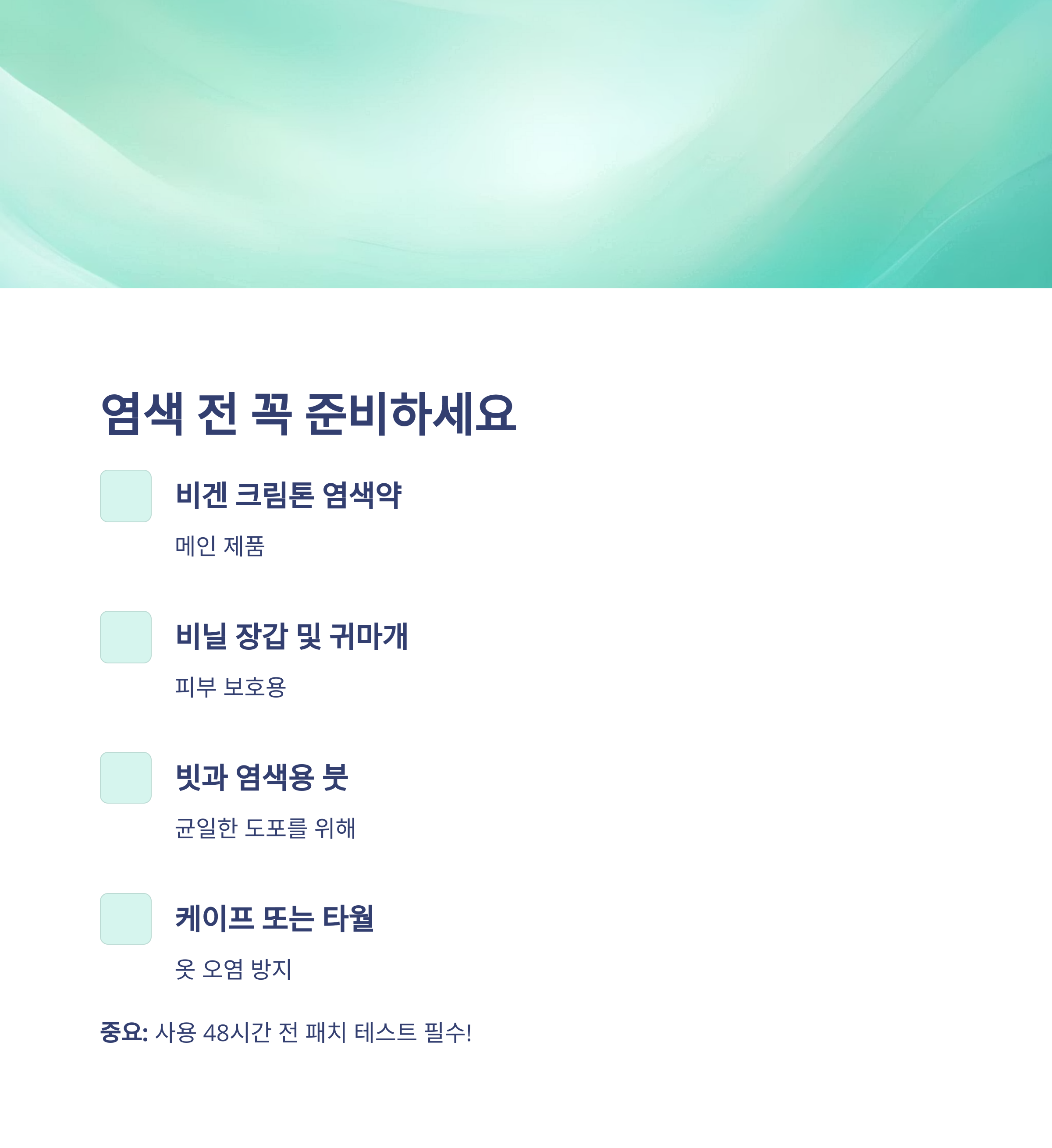 셀프 염색 전에는 다음과 같은 준비가 필수입니다.