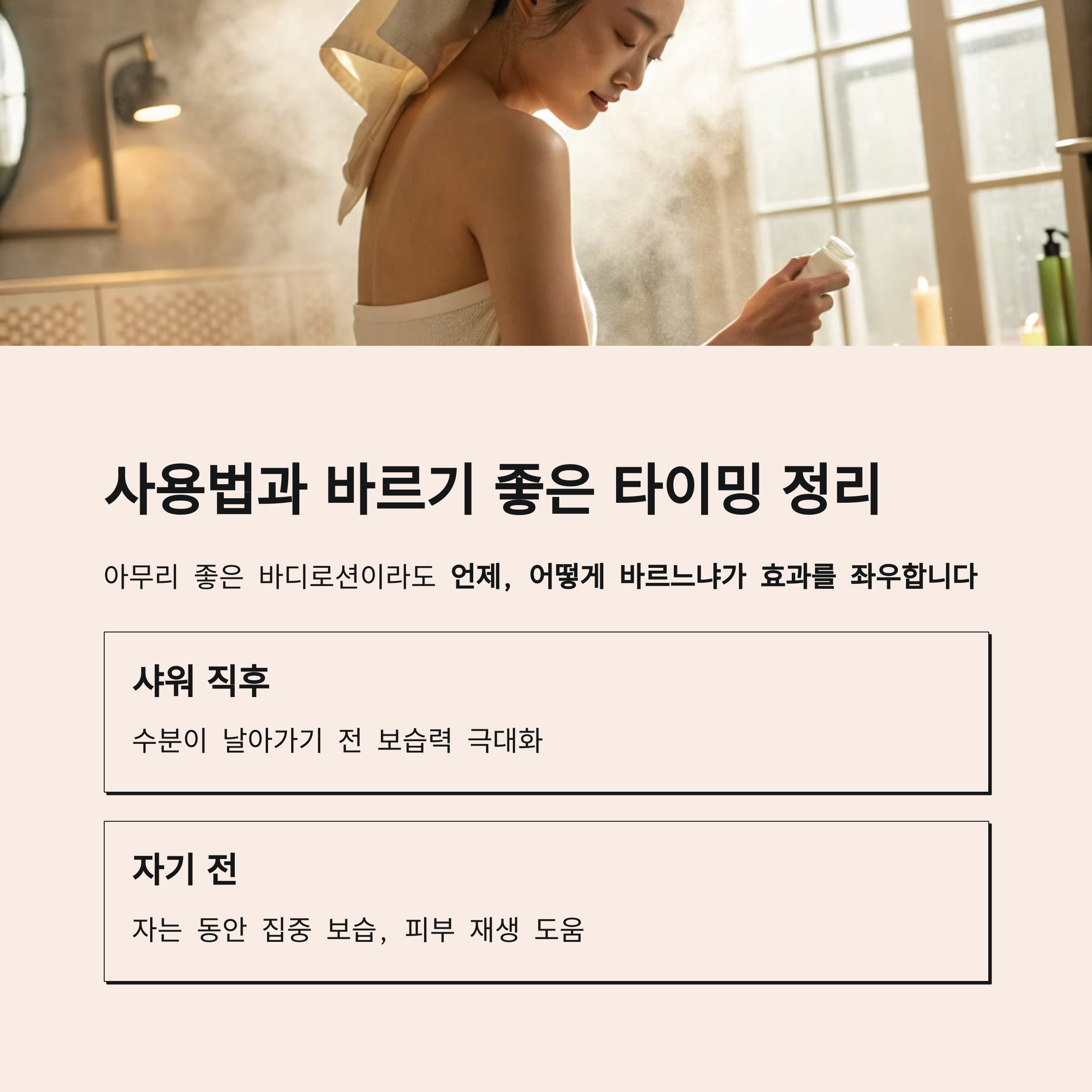 아무리 좋은 바디로션이라도 언제, 어떻게 바르느냐가 효과를 좌우합니다