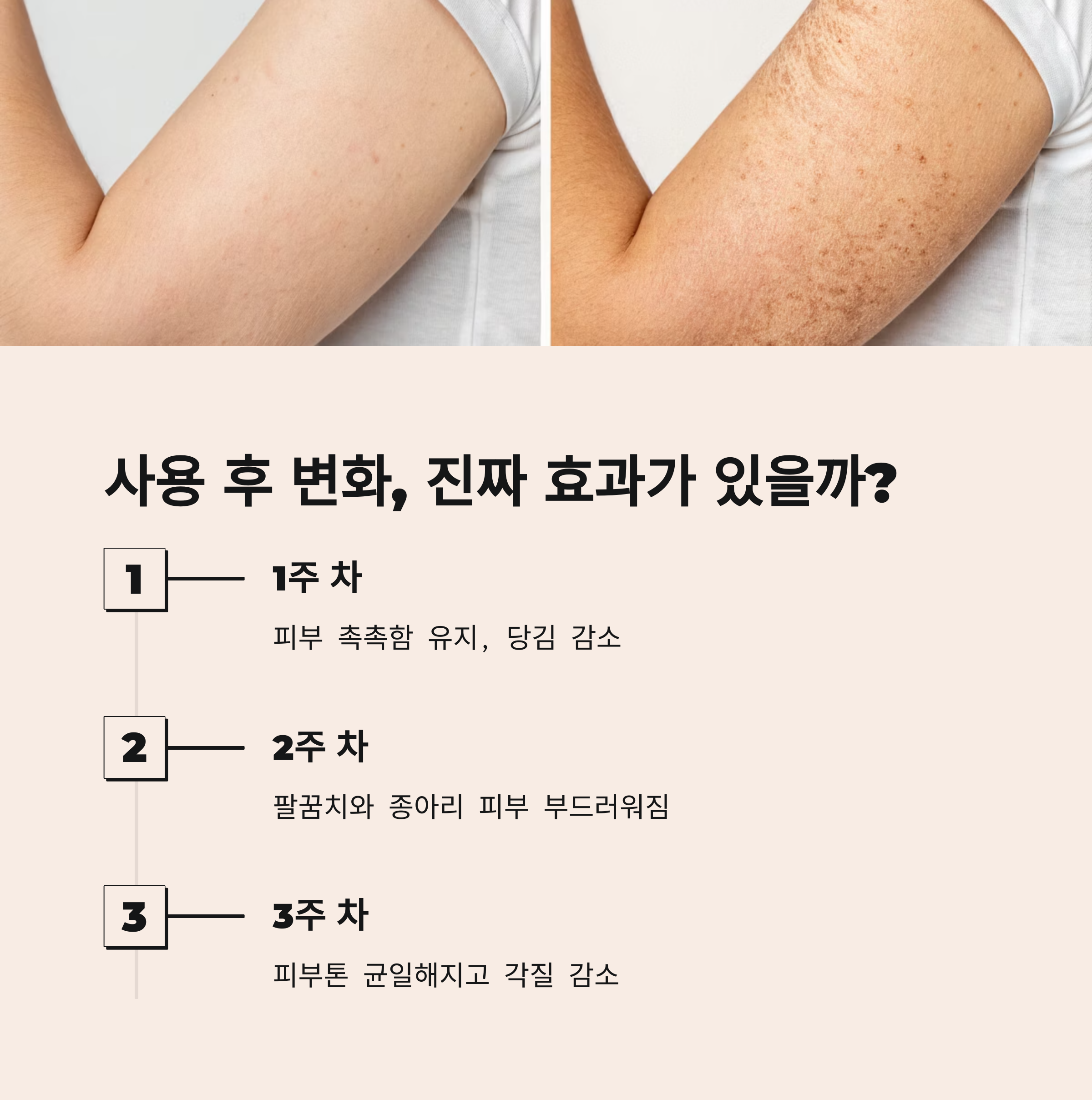 3주간 매일 아침 저녁으로 사용해본 결과, 팔꿈치와 종아리 피부가 확실히 부드러워졌습니다