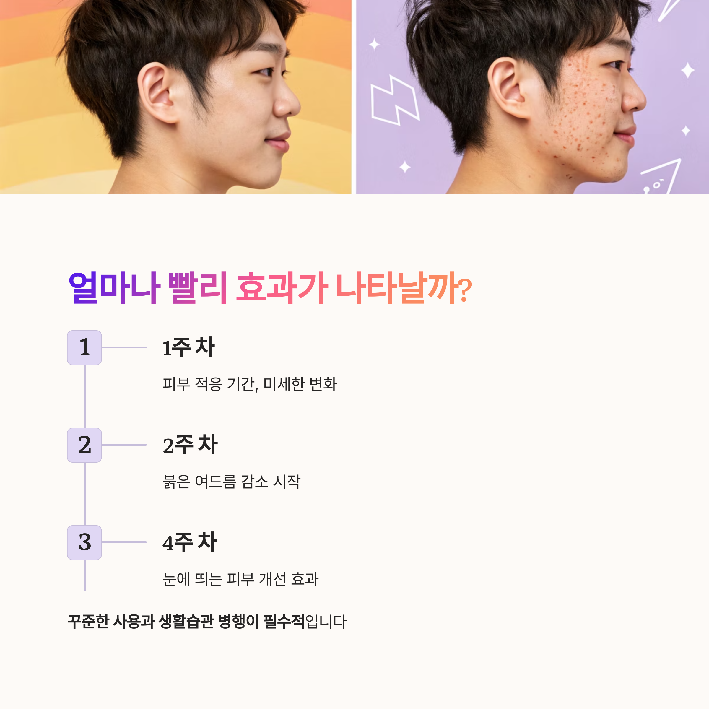꾸준한 사용과 샤워 후 보습, 수건 관리 등 생활습관 병행이 필수입니다