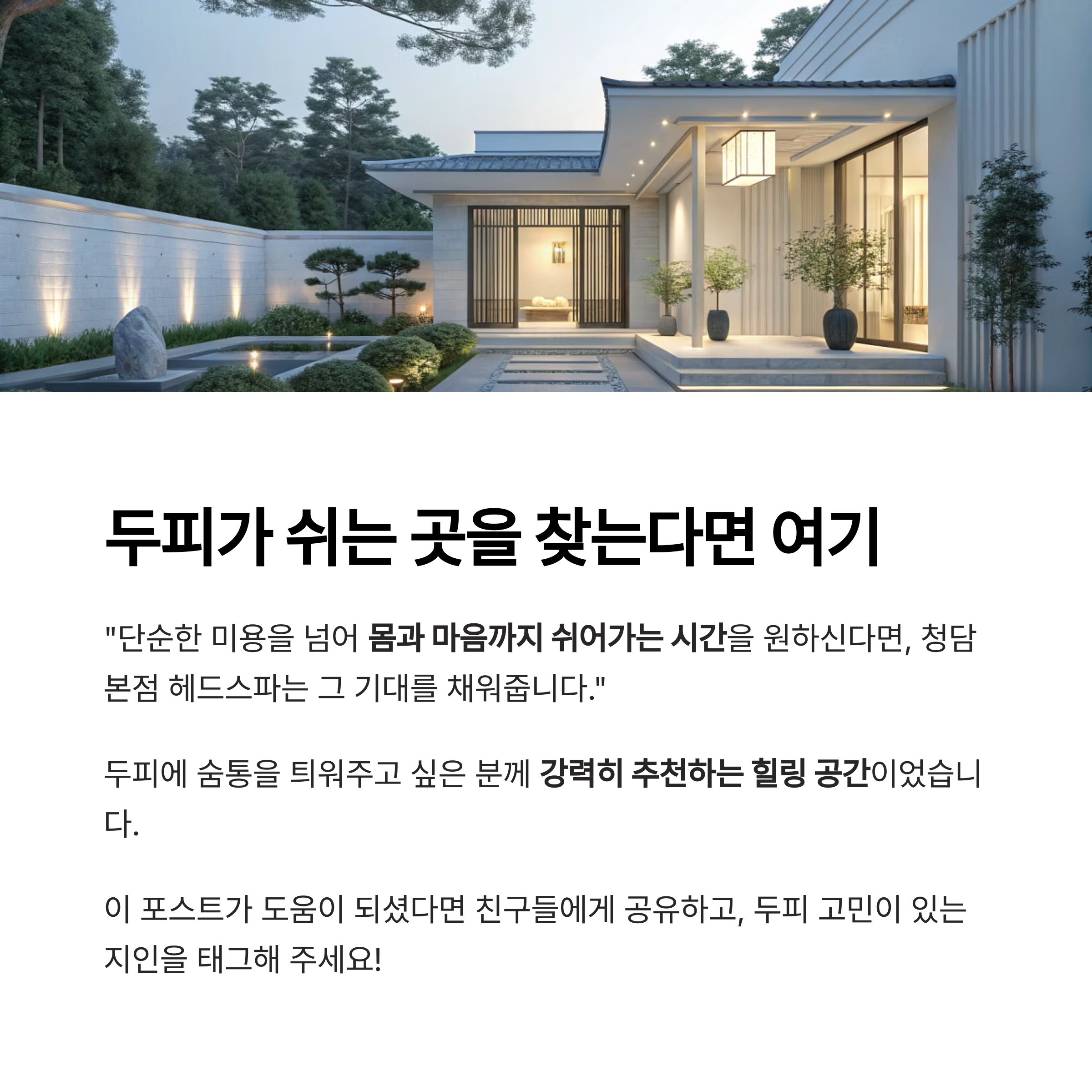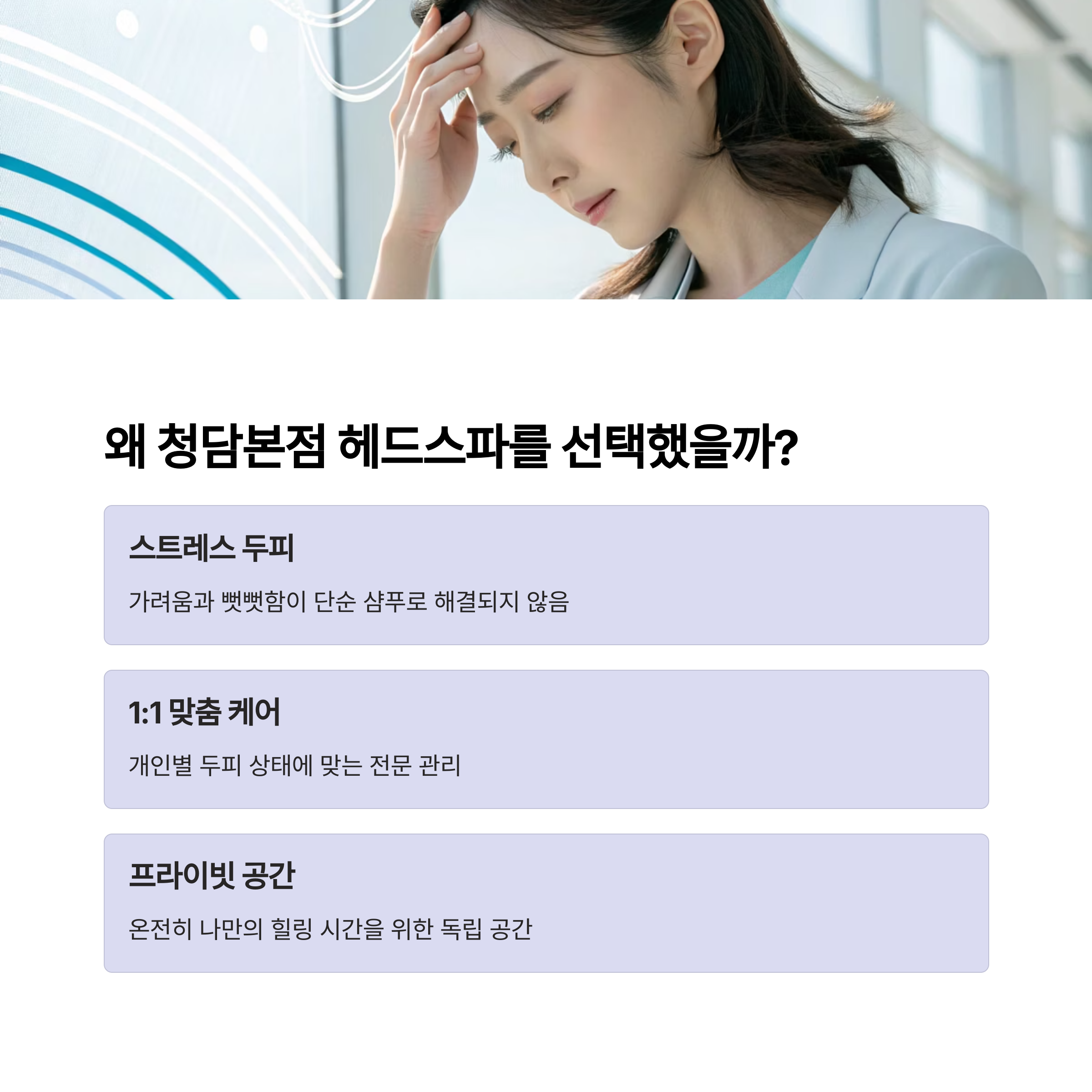 "단순한 미용을 넘어 몸과 마음까지 쉬어가는 시간을 원하신다면, 청담본점 헤드스파는 그 기대를 채워줍니다"