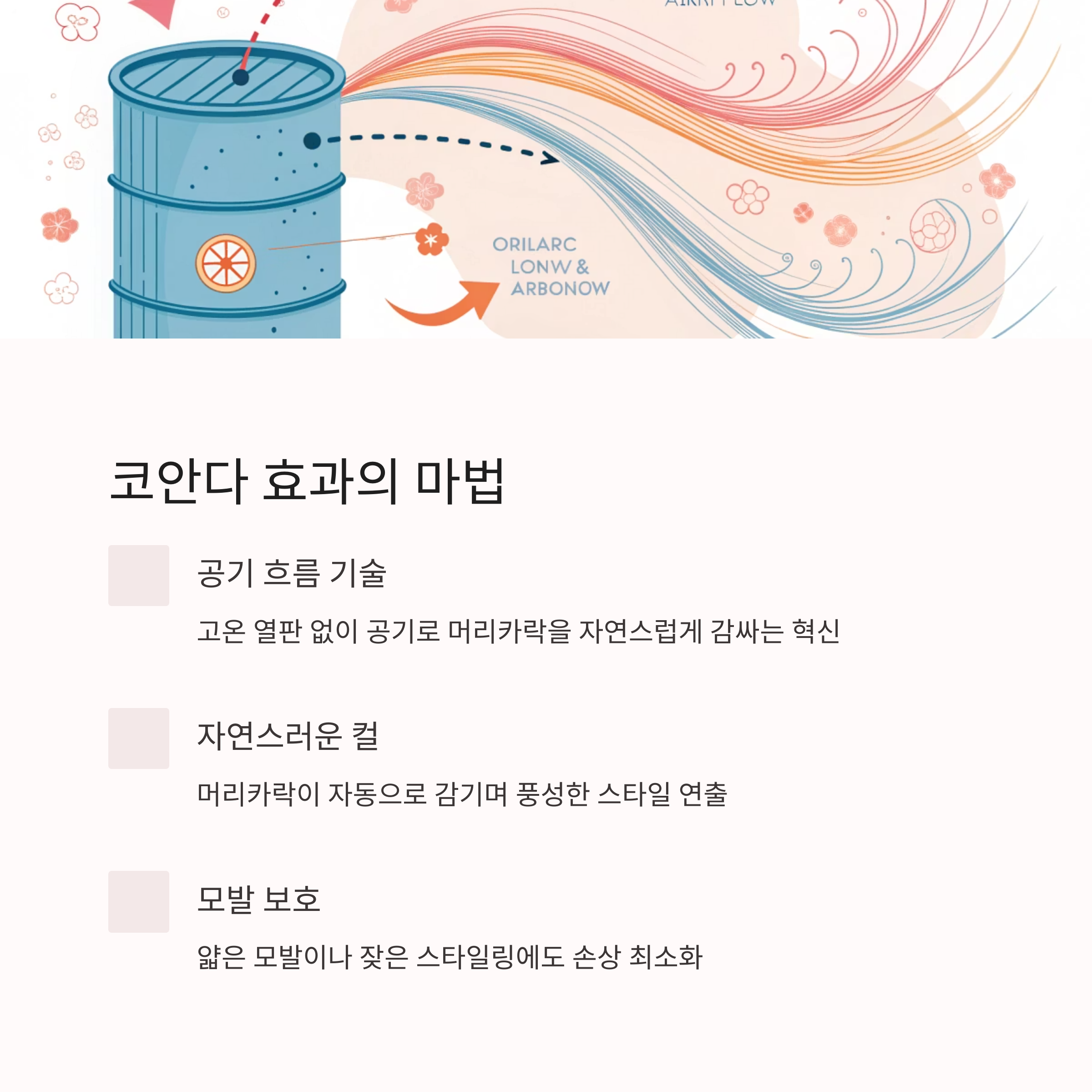 다이슨 에어랩은 일반적인 열판 방식이 아닌 **공기 흐름을 이용한 ‘코안다 효과’**로 작동합니다.