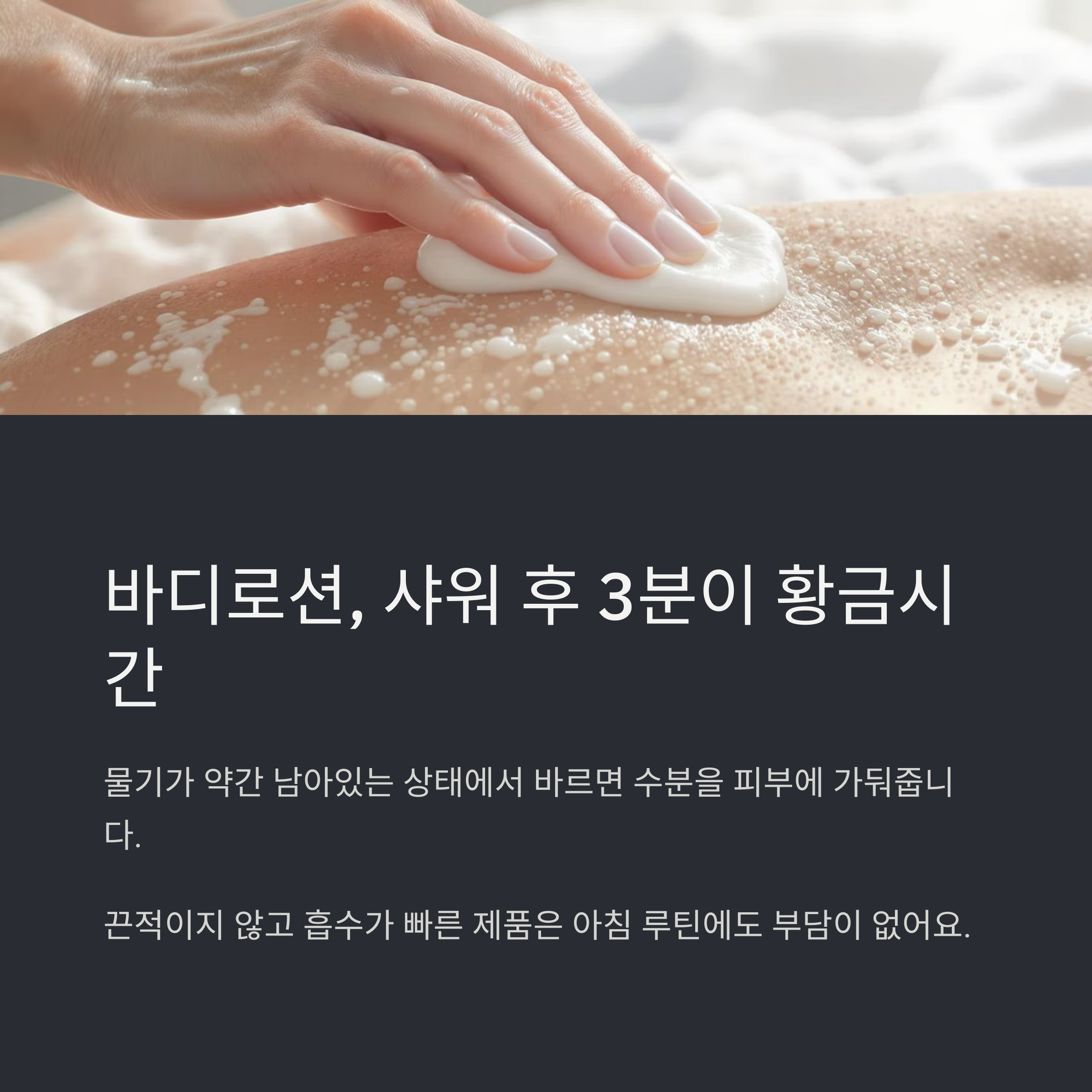 샤워 후 수분이 날아가기 전인 3분 이내에 바디로션을 발라야 보습 효과가 극대화됩니다.