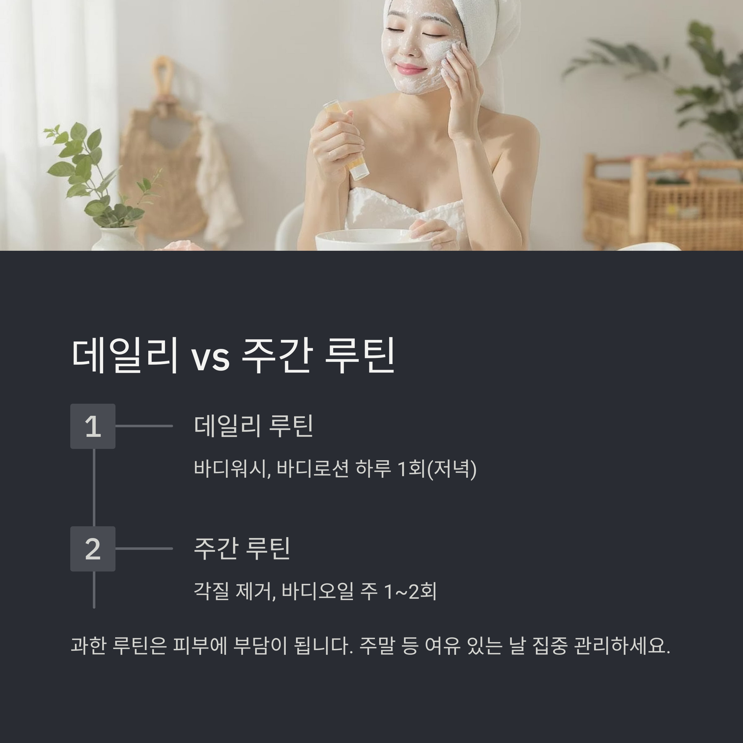 | 주간 루틴 | 각질 제거, 바디오일 | 주 1~2회 |