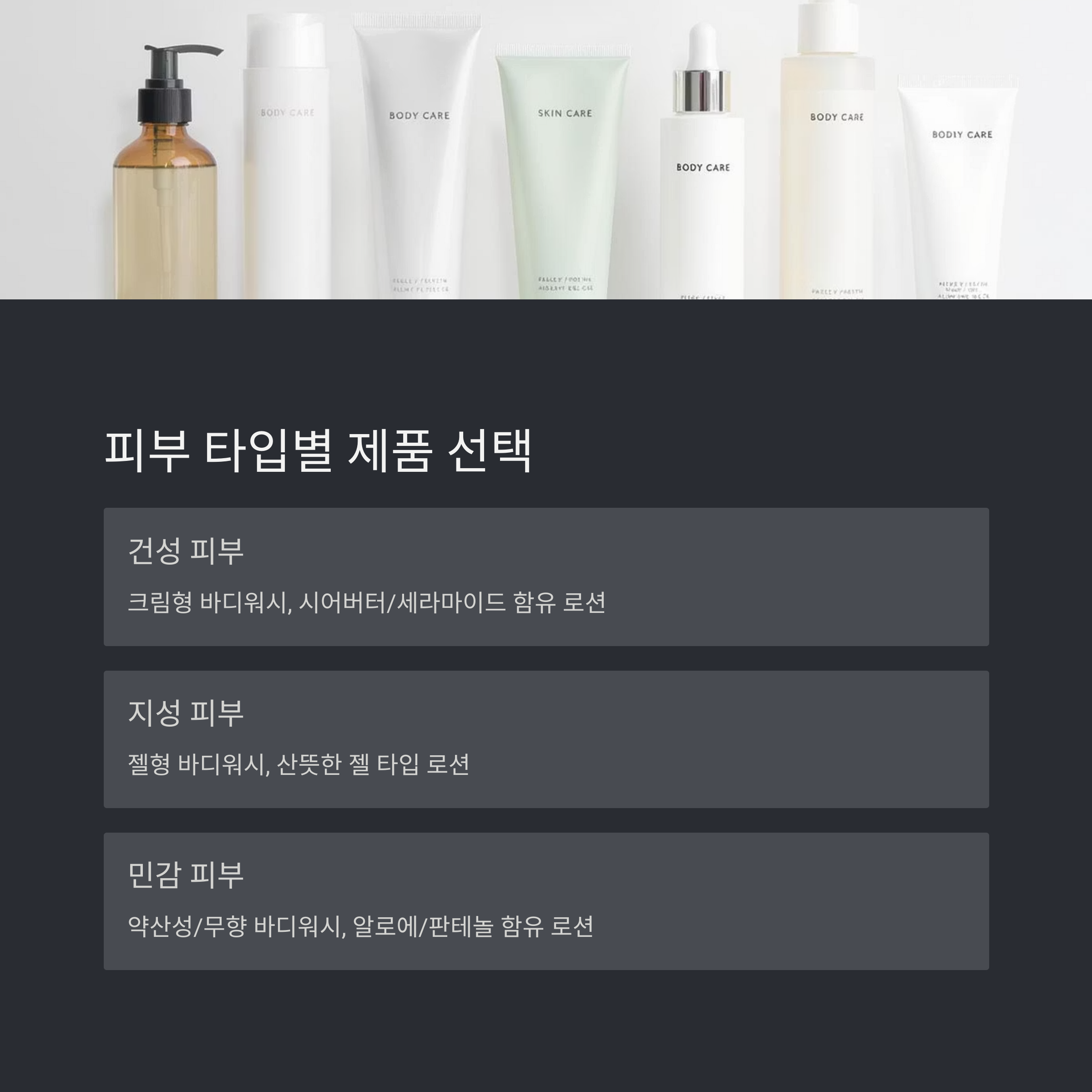 이 글에서는 피부 타입별 바디케어 루틴과 올바른 제품 사용 순서, 주의할 점까지 자세히 안내드립니다.