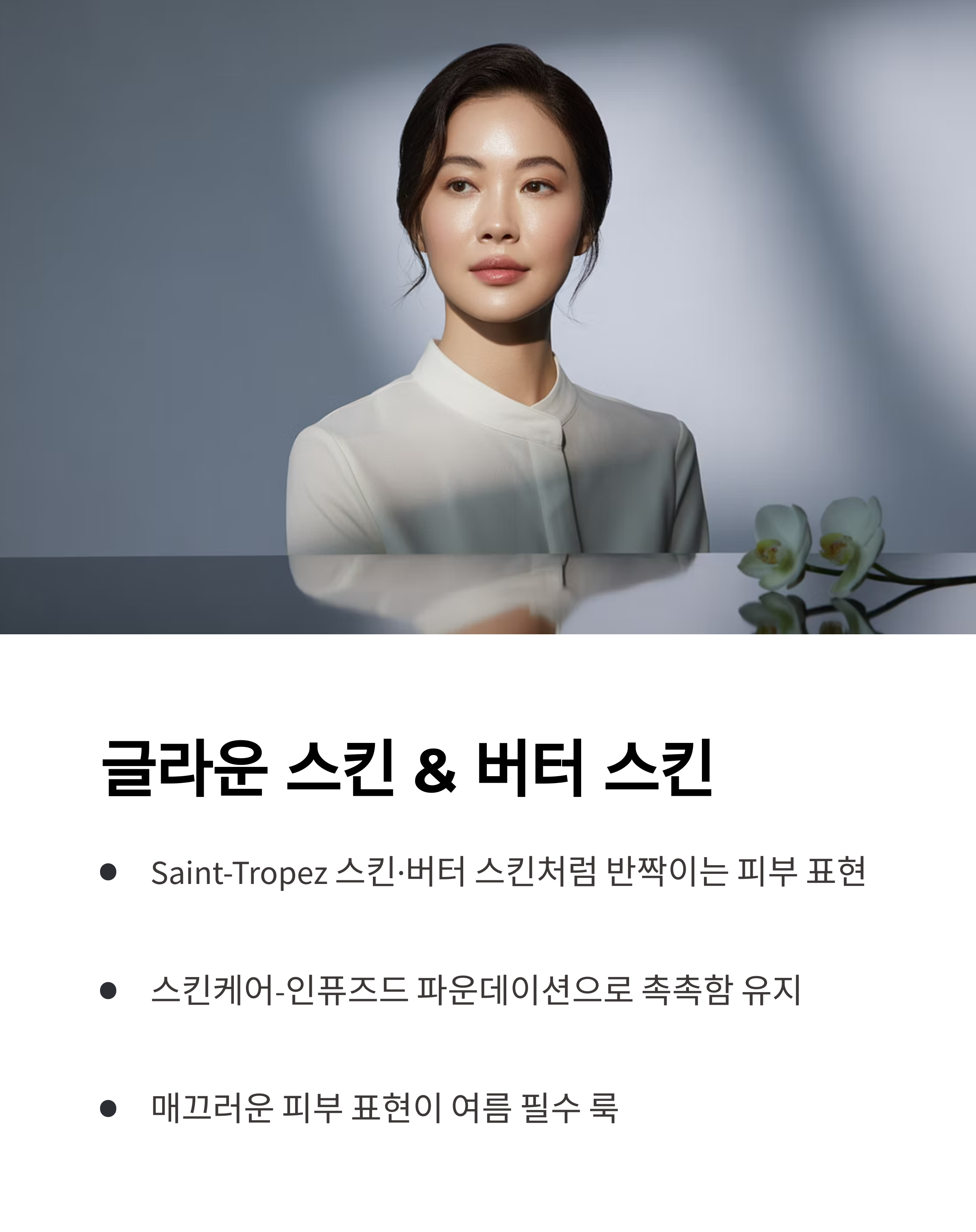 - Saint‑Tropez 스킨·버터 스킨 같은 반짝이고 매끄러운 피부 표현이 여름 필수 룩입니다. 스킨케어-인퓨즈드 파운데이션도 인기예요