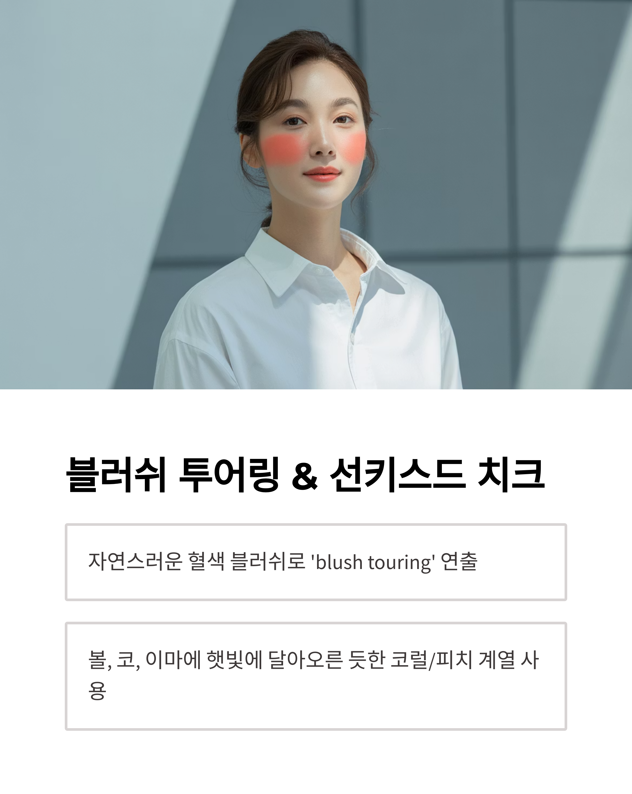 | 피부 | 톤업·수분 기반의 라이트 베이스 + 하이라이터로 글로우 연출 |