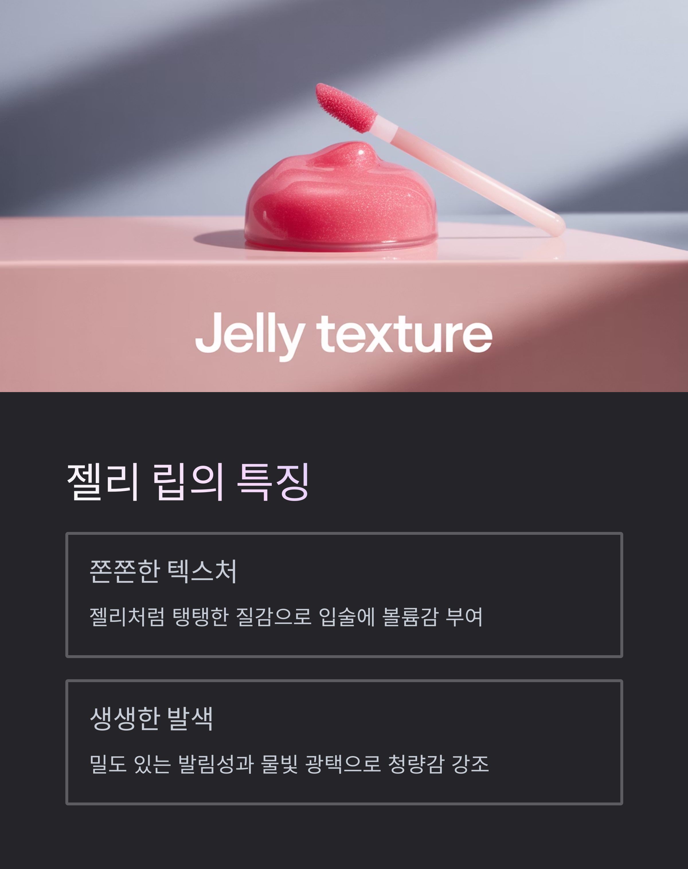젤리 립은 마치 젤리처럼 쫀쫀하고 탱탱한 질감이 특징입니다.