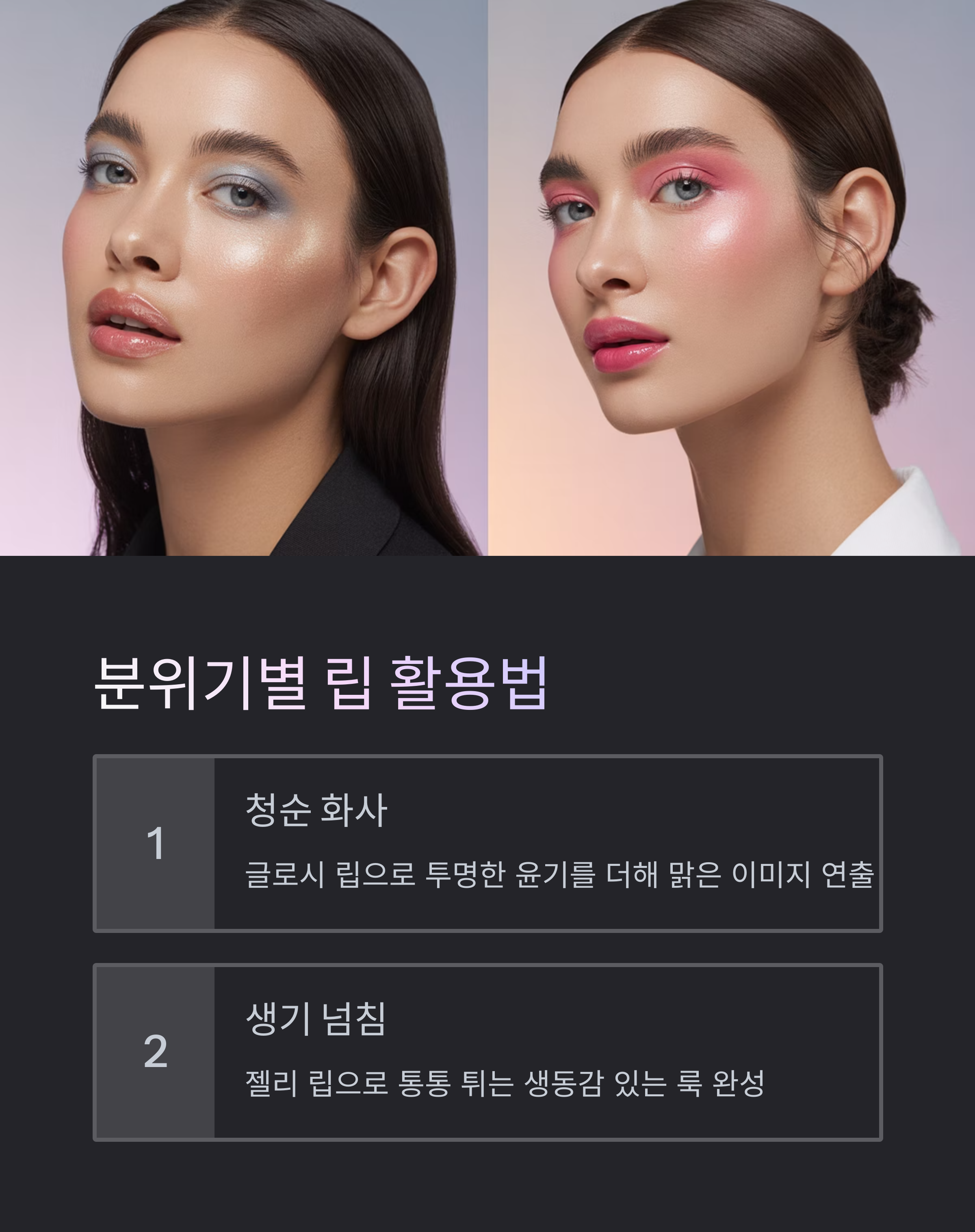 메이크업 무드에 따라 글로시 립과 젤리 립의 선택이 달라집니다.