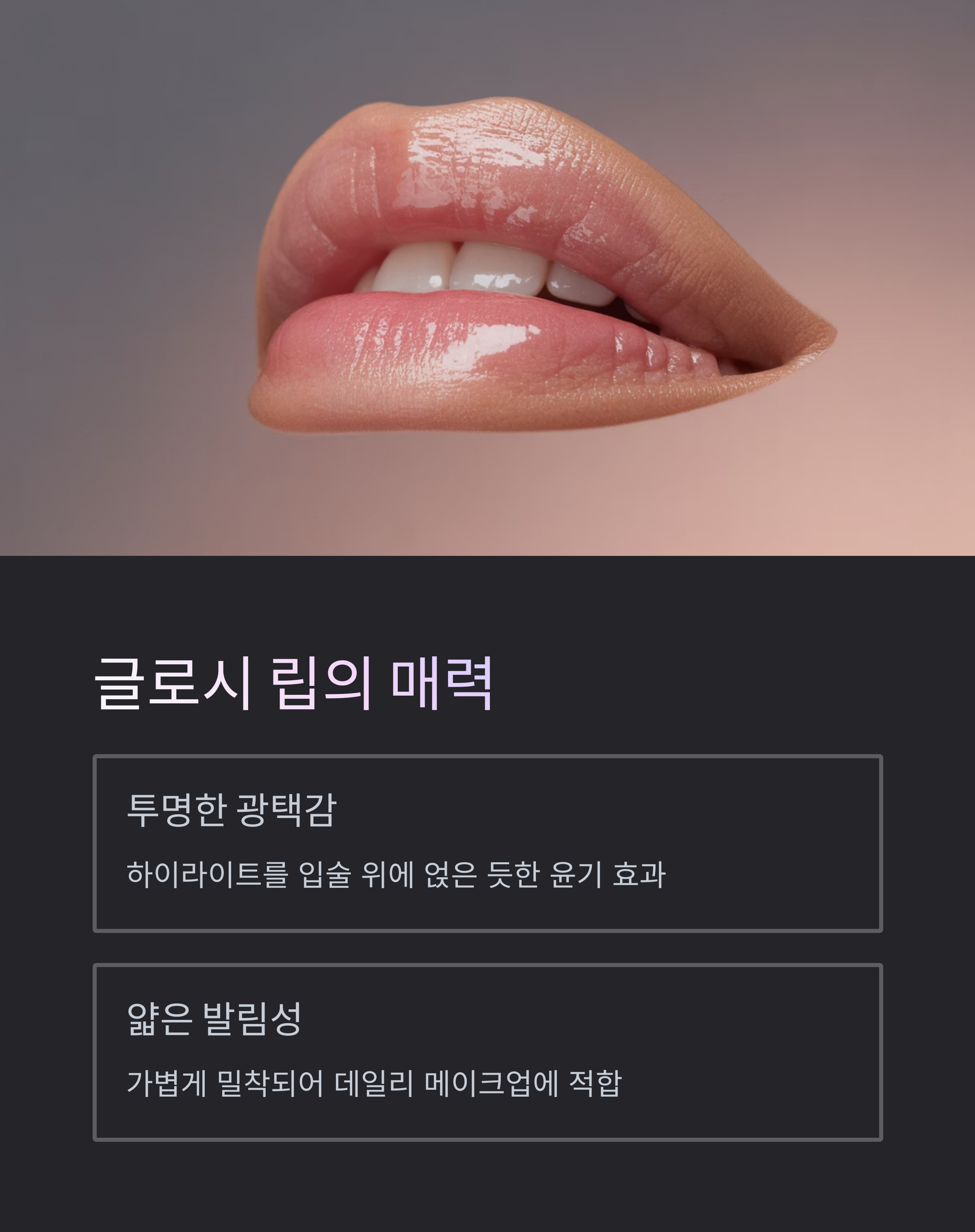 가볍고 산뜻한 사용감이 중요합니다. 글로시 립은 유분이 적은 제형이
