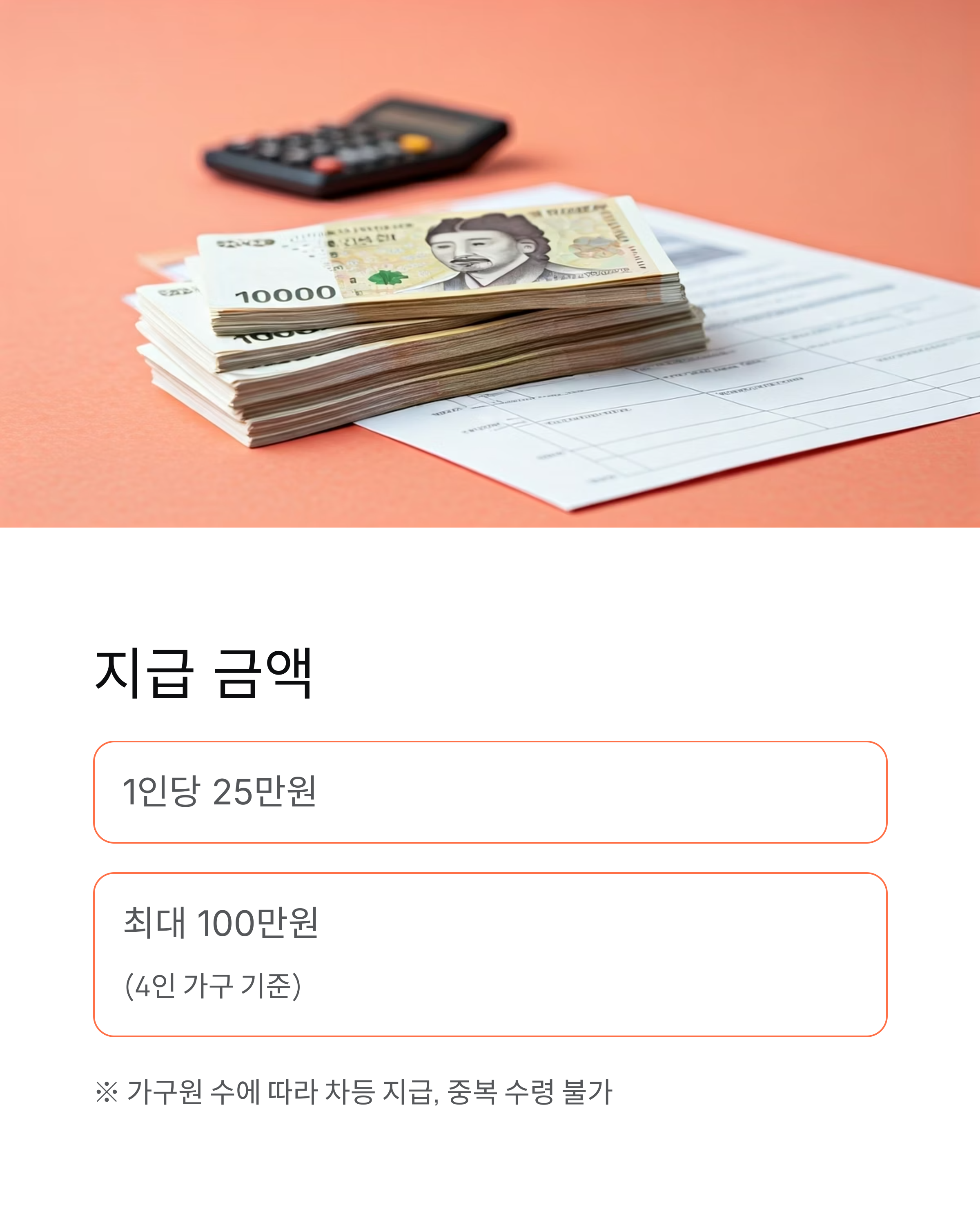 가구원 수에 따라 차등 지급되며, 중복 수령은 불가능합니다.