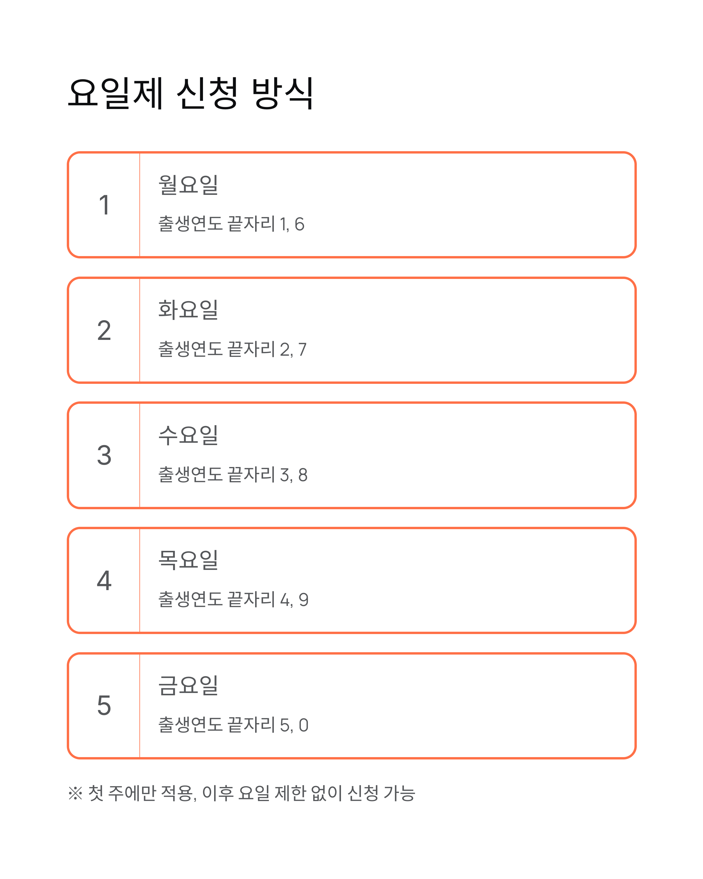 이와 같은 요일제는 시작일 기준 첫 주에만 적용되며, 이후에는 요일 제한 없이 신청이 가능합니다.