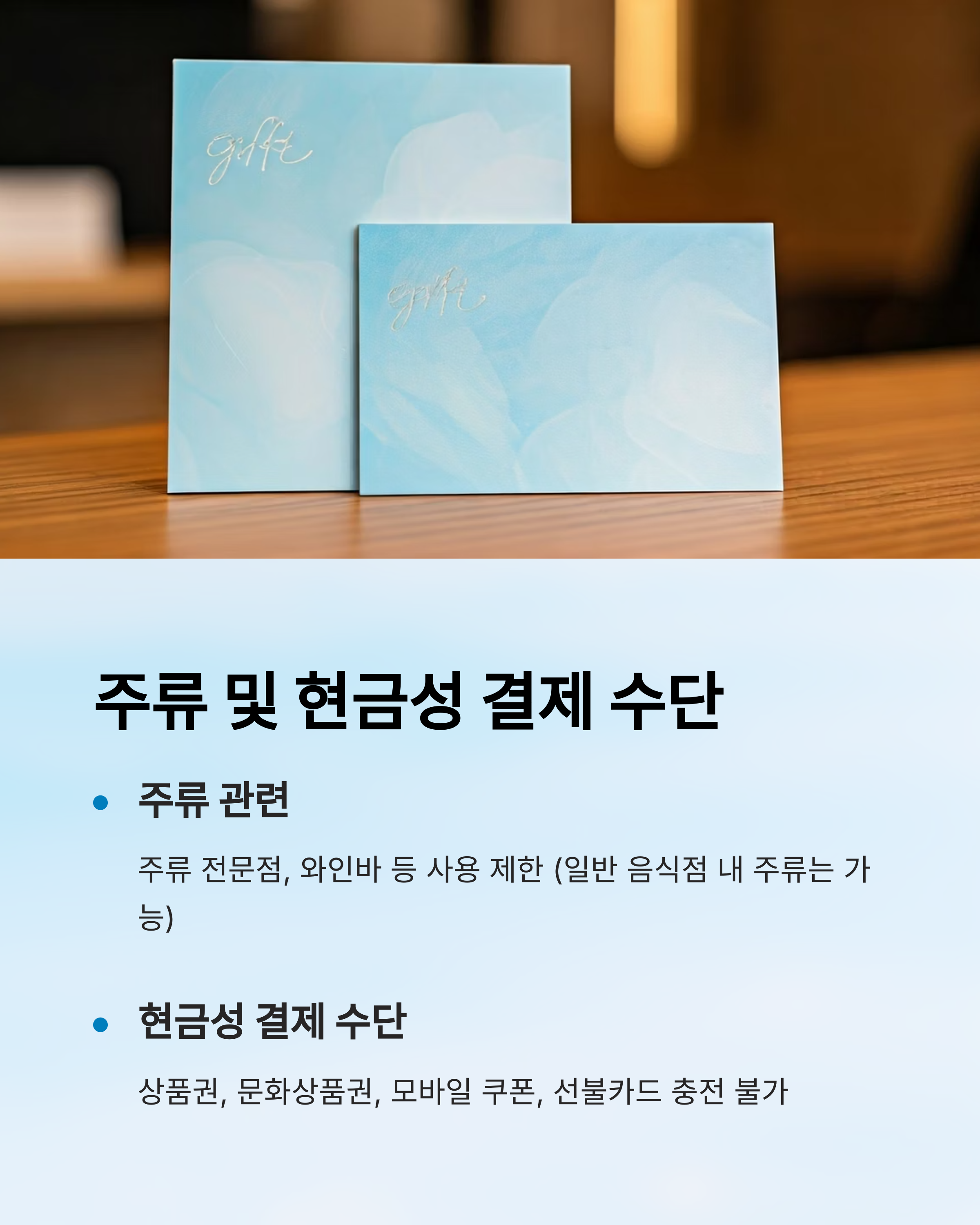 술을 주로 판매하는 주류 전문점, 와인바 등에서는 사용이 제한됩니다.